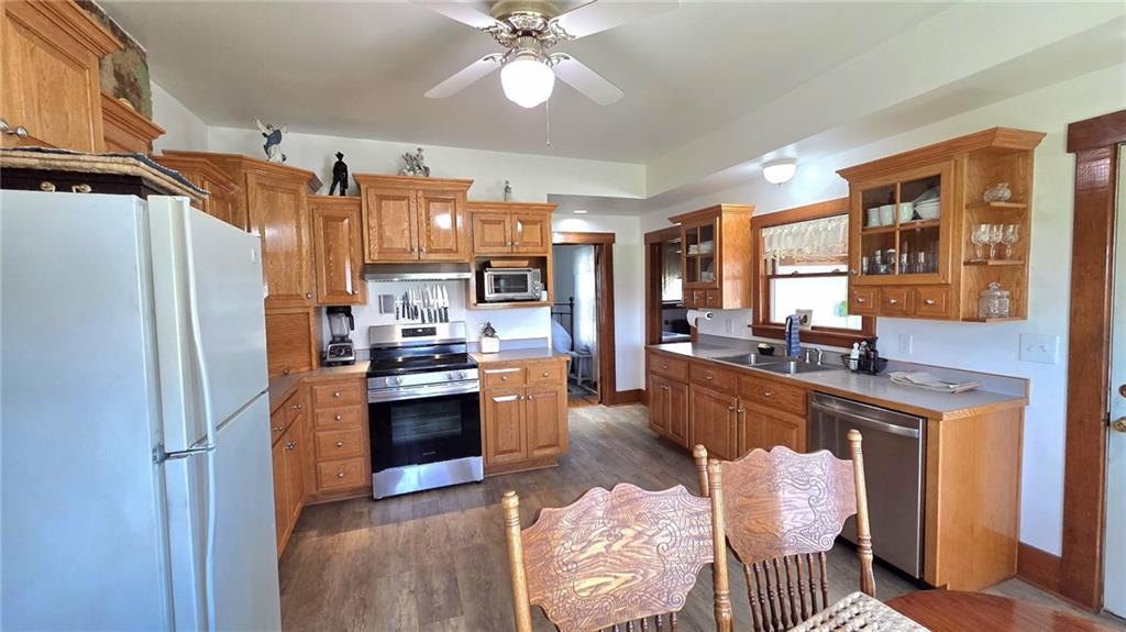 Dead End Road, Picture Perfect 35 Acre M/L Mapleton, KS Homestead! This meticulously maintained 3-bed, 2-bath home is impressive from the moment you pull up. The home has been preserved, maintaining much of the beautiful woodwork throughout, while modern upgrades make this home inviting and comfortable. The home has received upgrades, including newer vinyl exterior windows, complete custom solid oak kitchen cabinetry & countertops. Just off the kitchen is a grand dining room featuring original French doors. Additionally, this home features a huge sunroom, multiple large closets, and an unfinished partial basement. As you enter the front door, you will be greeted by the beautiful, original staircase banister that leads you to 2 bedrooms and 1 bath, featuring a beautiful, primitive claw-foot tub. Need room for additional guests? This property features a detached guest quarters. This is nicely finished, featuring heating and cooling. Multiple storage sheds and parking places exist in the 2 detached garages and one turn-of-the-century impressive old school hay barn. The hay barn upstairs is in very nice condition and is currently used for storage. The land is equally impressive, featuring lush cool-season grasses, and barbed wire fencing for horses, 4 ponds throughout the property providing excellent year-round livestock water source, or the fishing enthusiast. The south side of the land rolls slightly downhill with thick brush and trees providing an excellent white-tailed hunting experience. This is a rate property as it has had all the work done. *Furnace is propane, propane is owned.