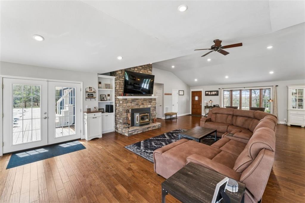 Welcome to 14441 Highway U, Cross Timbers, MO 65634, a beautifully maintained 3-bedroom, 3-bath home with over 3,700 sq ft, perfectly positioned on 20 scenic acres of mixed open land and mature woods. This is where modern comfort meets rural independence. From the moment you arrive, the oversized driveway and attached two-car garage with workshop space set the tone for functionality and scale. Step inside to discover a bright, open layout featuring quartz countertops, stainless steel appliances, and warm hardwood flooring, all anchored by a cozy living room fireplace that creates the perfect gathering space. The heart of the home flows seamlessly into a stunning dining area wrapped in windows, flooding the space with natural light and offering uninterrupted views of your private land. Just beyond, step out onto the expansive deck, where an above-ground pool with electric heater and outdoor entertaining space create the ultimate setting for summer nights and weekend gatherings. The newly finished basement (2023) adds incredible flexibility with an additional bedroom and full bathroom, making it ideal for guests, extended family, or multi-generational living. Outside is where this property truly separates itself. Enjoy your own private pond, wooded acreage with established trails for ATV riding and hiking, and two deer stands, making this a dream setup for hunting and outdoor enthusiasts. A dedicated shooting range further enhances the recreational appeal. For those seeking versatility and income potential, the 12x36 Amish-built log cabin with heat, AC, and pellet stove offers the perfect guest retreat, Airbnb opportunity, or private office space. Located on a paved road in the peaceful Cross Timbers area, this property offers the privacy buyers crave without sacrificing accessibility. If you’ve been searching for a Missouri acreage home with land, privacy, hunting, and modern upgrades. This is it. Optionally comes fully furnished.