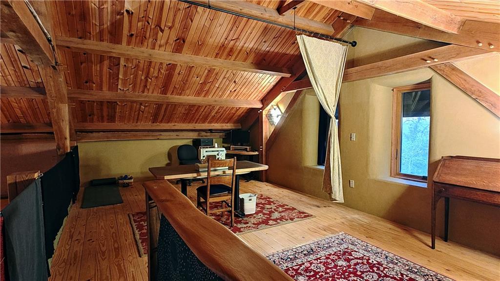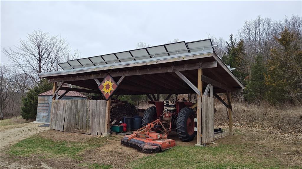 12 year-old Net-Zero Custom-Built Timber Frame Home on 27+ Private Acres with Stocked Pond Energy Independence, Privacy, Woods, Water, and Pasture — 12 miles from Lawrence: timber-frame home sits 500 feet off the road on 27+ acres overlooking the Buck Creek Valley. Designed for efficiency and built with the highest quality materials, it offers a rare combination of sustainability, recreation, and proximity to town. Durability and comfort are hallmarks of this home. You really must experience this home first-hand! 10 acres fenced pasture (high-tensile 4-wire electric fencing) 17 wooded acres with mature oak, hickory, walnut & hedge and over 1 mile of private hiking trails Stocked largemouth bass pond Pond aeration system installed 2025 Home positioned halfway up the hill for protection and views The Home: 1,550 sq ft PLUS 500 sq ft covered porch Traditional timber-frame construction (white oak) 2 bedrooms + flexible loft space (office/guest/yoga/studio) 20’ ceiling peak in open living area Large kitchen with island Zero-entry walk-in shower Straw bale exterior walls (R-40) Structural insulated panel roof (R-40) Andersen casement windows Standing-seam metal roof Mitsubishi mini-split heat pump (new coil 2025) Pacific Energy Alderlea wood stove Complete architectural plans available Natural materials create exceptional indoor air quality and a calm, grounded feel Net-Zero Solar Energy: Installed in 2018 Produces 8,500–9,000 kWh annually, historically exceeds total household usage Inverter replaced March 2024 Water & Infrastructure 8,000-gallon rainwater cistern Pump house/workshop Whole-house filtration system (spin-down, carbon/sediment, UV, optional chlorinator) Outbuildings 11' x 18' workshop / pumphouse 15’ x 45’ pole barn (3 bays) 16’ x 32’ pole barn (2 bays) Converted 15' diam. grain bin with concrete floor, electricity, lighting & exhaust fan 13 mi. to Perry Lake Marina 23 mi. to Clinton Lake Marina