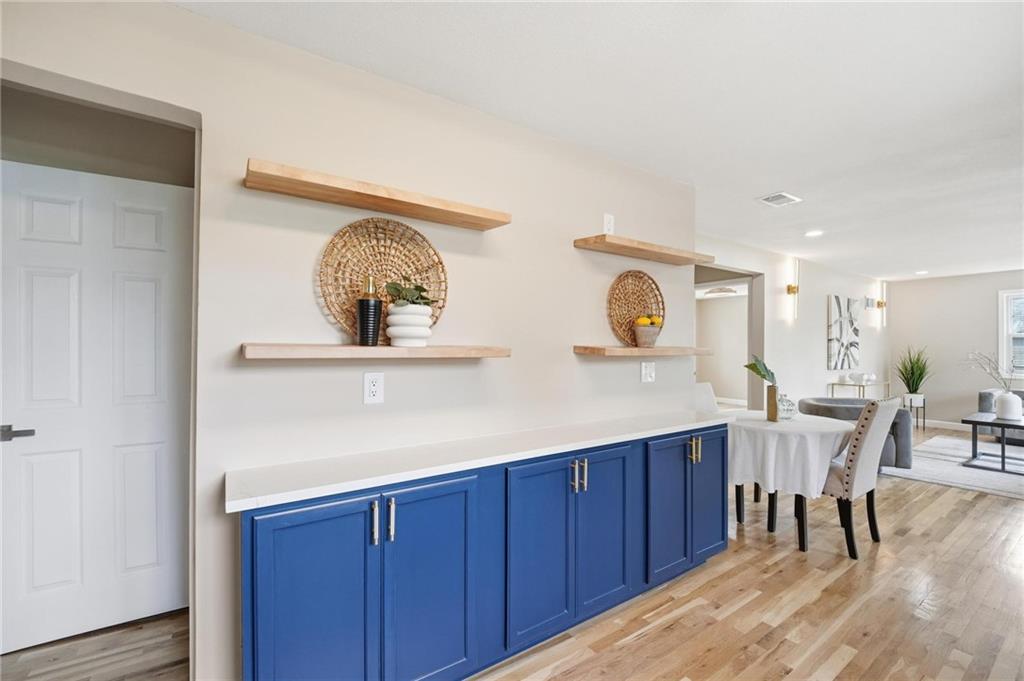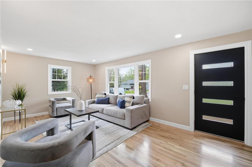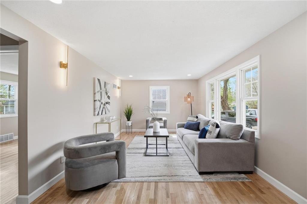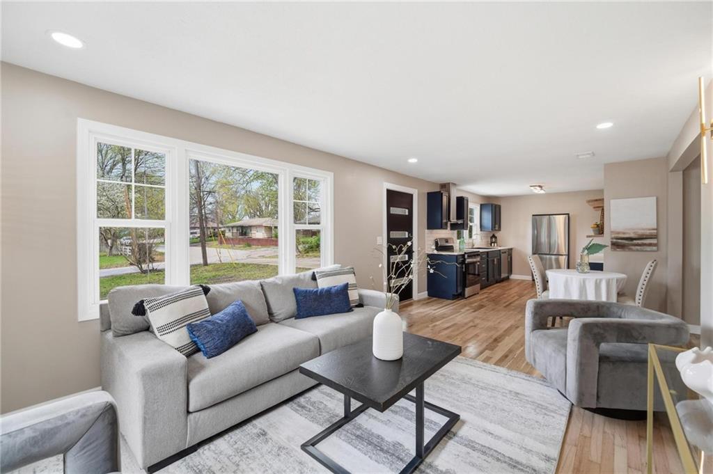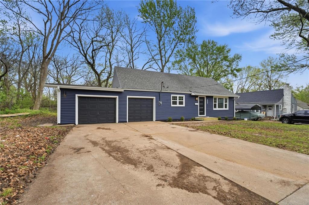 Fully renovated and move-in ready, this 3 bedroom, 2 bathroom home in Kansas City, Kansas delivers modern style and peace of mind on a spacious .30-acre lot. Step inside to an open-concept living area flooded with natural light, featuring refinished hardwood floors, fresh paint, and sleek modern lighting that creates a warm, welcoming feel. The stunning kitchen showcases navy cabinetry, quartz countertops, brushed gold hardware, floating wood shelves, stainless steel appliances, and a large single-basin sink overlooking the front yard. The private primary suite offers a beautifully updated bathroom with custom tile, contemporary fixtures, and a clean designer look. Additional updates include brand new vinyl siding, new gutters, new HVAC, and a new water heater, giving you confidence for years to come. Outside, the oversized two-car garage, expanded driveway, and deep lot provide plenty of parking, storage, and outdoor living potential. All of this is offered at just $275,000—schedule your showing and see how 2849 N 48th Terrace checks every box.