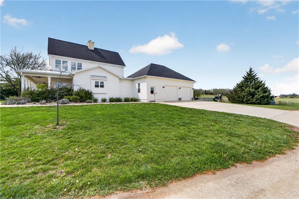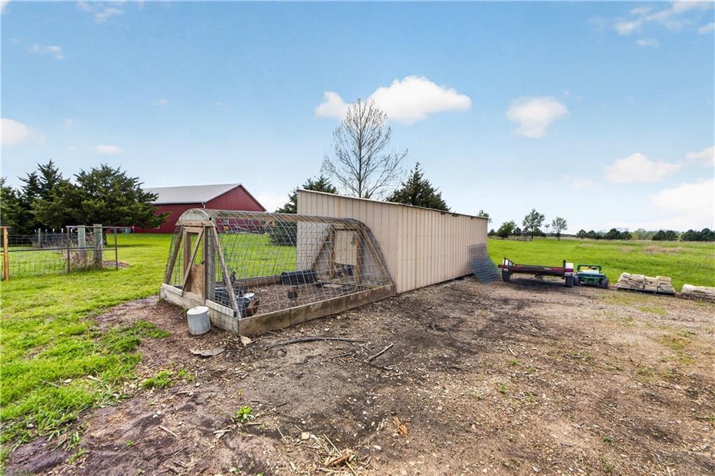 10 acres on blacktop — a rare blend of modern comfort and full-function hobby farm living. Built in 2020 as the sought-after builder’s personal residence, this open-concept home offers 6 bedrooms, 3.5 baths and 4,032 total sqft with thoughtful finishes throughout. Main living features include a dramatic two-story great room with abundant windows, wide-plank white oak engineered floors, a see-through fireplace between the dining room and living room, and a chef-ready kitchen flowing to living and entertaining spaces. The primary suite is conveniently located on the main level and opens to a large screened porch that, together with the dining room, leads out to an expansive concrete patio — ideal for indoor-outdoor living. Two oversized bedrooms upstairs include vanities/sinks plus a full upstairs bath; three additional bedrooms are located below grade. Practical comforts: main-level and basement laundry, an oversized two-car garage, and a large finished six-sided concrete storm shelter. Outdoor and outbuilding amenities are built for hobby farmers, equestrians, and weekend hosts. Approximately 2.5 acres are fenced and improved with a horse barn that has power and water. The back 5 acres serve as productive hay pasture. The 2,400 sqft barn/shop includes a 1,600 sqft insulated, heated & cooled shop space with two overhead doors and a full bath, plus an 800 sqft one-bedroom apartment with kitchen/living area, full bath, W/D hookups and a wraparound covered porch — perfect for rental income, guest quarters, or on-site help. Additional property highlights: chicken coop with power, water and indoor/outdoor access; raised-bed garden area with water run; a 33-ft above-ground pool with deck and awning for summer entertaining; and abundant acreage for riding, gardening, or expansion. Location is exceptional — just one mile from the new elementary school in the award-winning Basehor-Linwood School District.