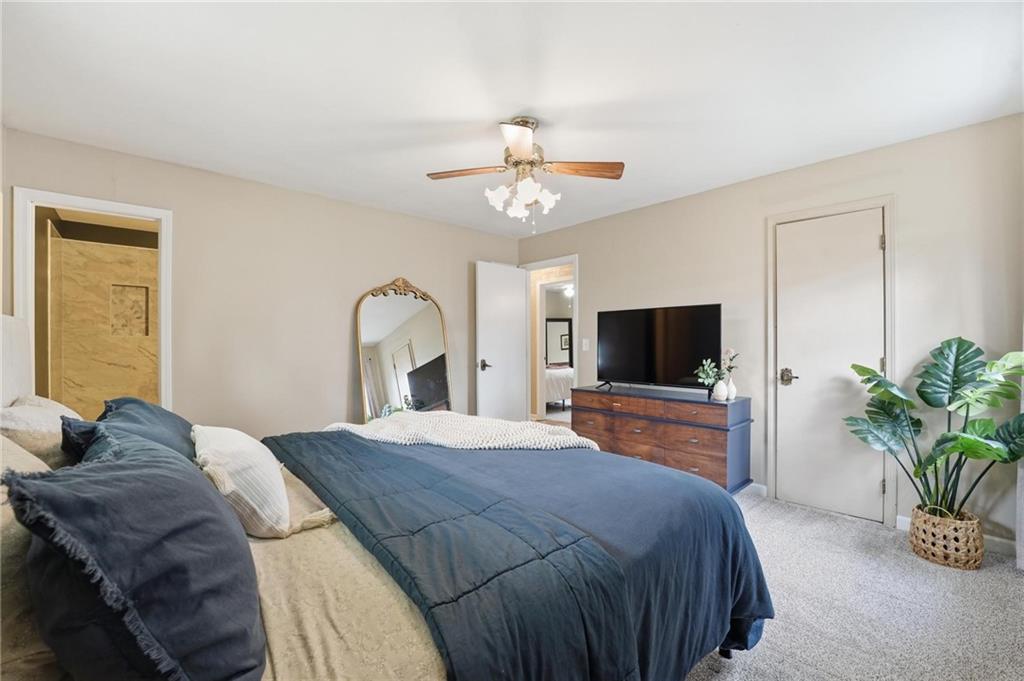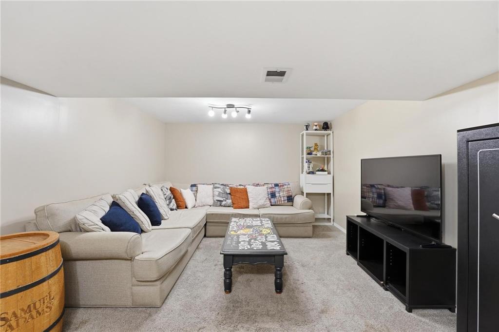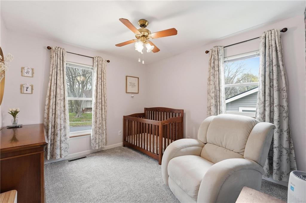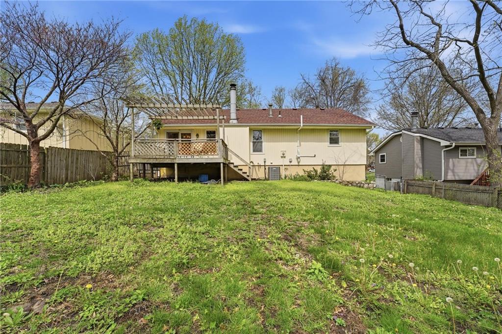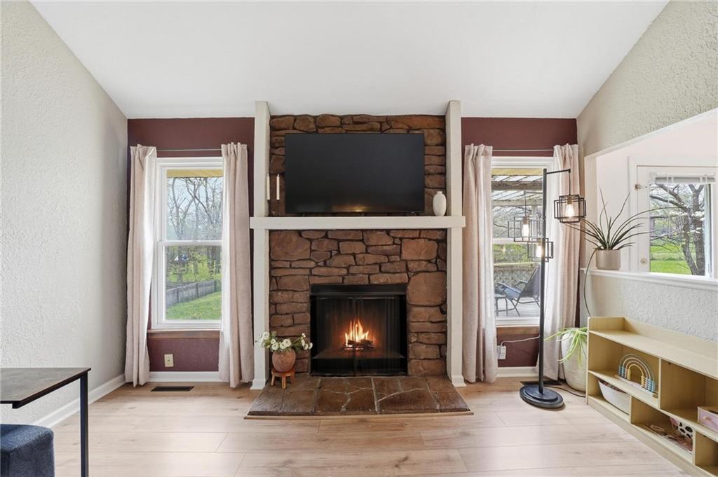 This stunning raised ranch home has been beautifully updated with modern luxury vinyl plank flooring, new carpeting, a new roof, a tiled primary bathroom shower, and fresh paint throughout. Upon entering, you'll notice the high ceilings and wooden beam accents that create a spacious atmosphere, warmly complemented by a charming stone fireplace. The layout seamlessly flows into a dining room featuring a back door that leads to the deck. The kitchen is equipped with ample cabinetry and smart counter space for all your culinary needs. Down the hallway, you will find a coat closet, linen closet, a full bathroom with a large vanity and a shower over the tub, and three cozy bedrooms at the end of the hall, each adorned with plush carpeting. The primary bedroom offers generous space and a stunning ensuite, complete with a new tiled shower, vanity, and mirror. The finished basement includes a recreation room and a laundry room with fantastic storage, including storage shelves that stay. The two car garage provides access to the basement, featuring space for a coat rack and additional storage behind the shutter doors in the recreation room. The back deck, accessible from the dining room via the back door, overlooks a fenced backyard that backs up to trees, creating a serene retreat. This home is situated in a quiet cul-de-sac within the North Kansas City School District, with Staley High School as the designated attendance school.
