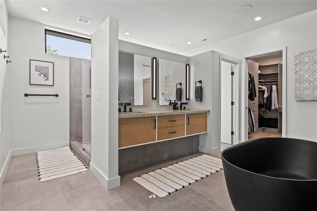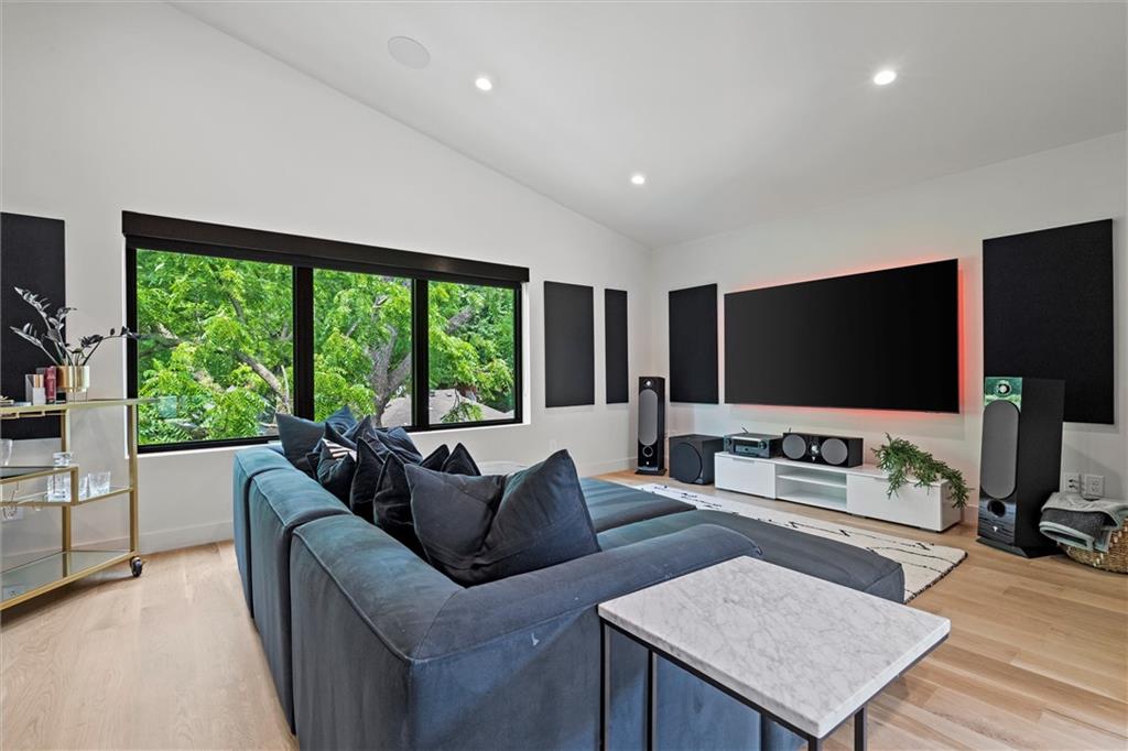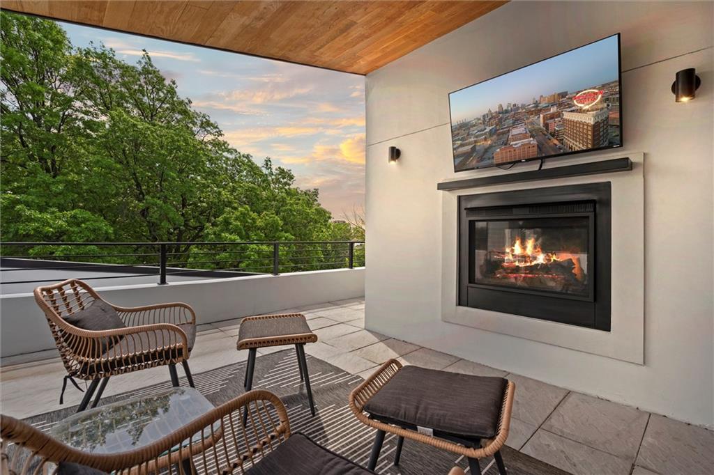 Discover this stunning custom-built home in the heart of Kansas City's sought-after West Plaza neighborhood. With an unbeatable location just minutes from Westport, The Country Club Plaza, and the Nelson Atkins Art Museum, this 2022 Artisan Home is an entertainer's dream. The exterior features gas lanterns, stucco, and a glass garage door with powder coated black metal framing, providing ample off-street parking with a three-car garage. Inside, you'll find 7-inch white oak hardwood floors, custom-fabricated steel railings, and Restoration Hardware light fixtures throughout. The second level includes a kitchen with inset walnut cabinets, hidden appliances, and stunning azul quartz countertops from Italy, leading into the main living area with an 80-inch gas fireplace and floor-to-ceiling charcoal concrete. The dining room features a 24-foot vaulted ceiling and large windows with electric blinds. The home offers multiple outdoor spaces, including concrete patios, a privacy-fenced backyard, and a 200-square-foot rooftop deck with views of the Country Club Plaza. With two primary suites, a potential fifth bedroom, and a top-floor movie theater with a soundproofed entertainment area, this home truly has it all. Freshly painted interior. Sellers are willing to include the home theatre equipment with an acceptable offer. Don't miss your chance to own this masterpiece in West Plaza.