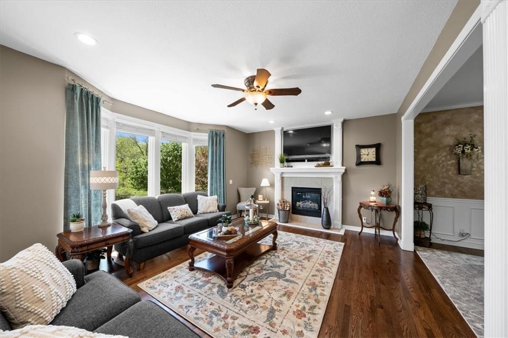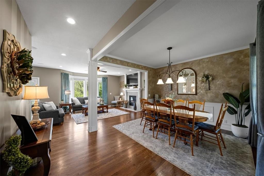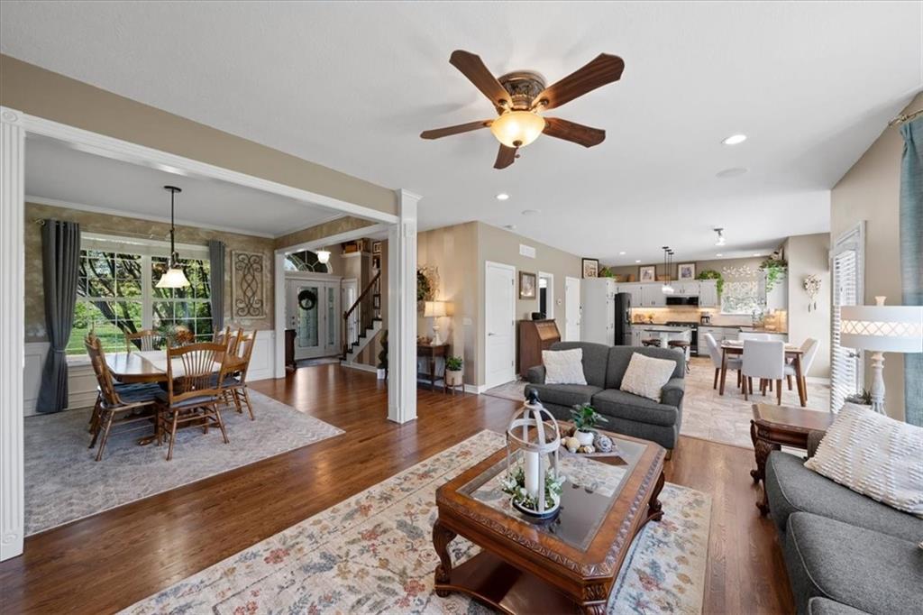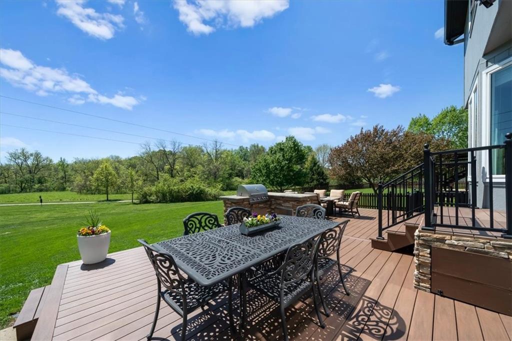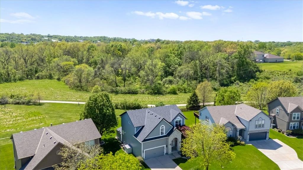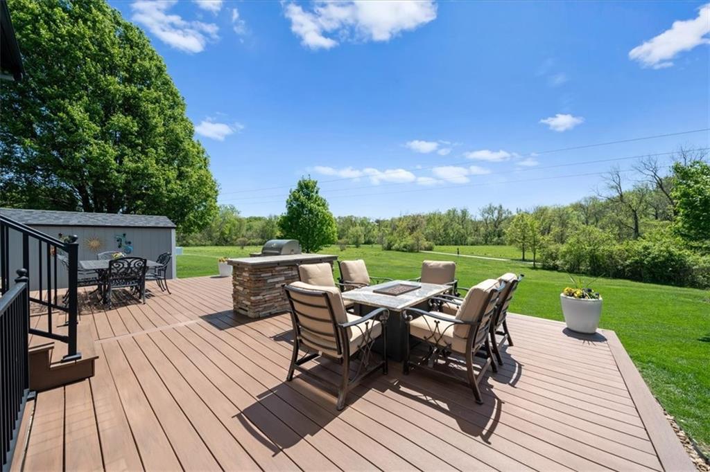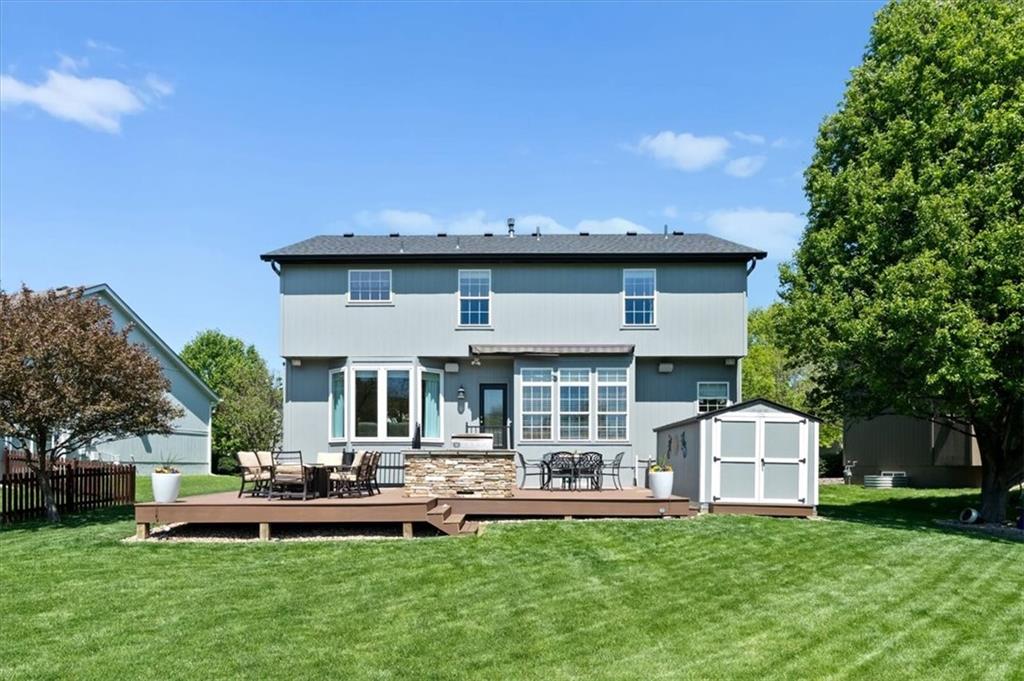 PRISTINE ONE OWNER HOME! This is a move-in ready home with 4–5 bedrooms, 4½-baths offers 3,160 square feet of refined living in the sought-after DeSoto School District. The main level features an open layout with hardwood floors in the family room and dining area. Kitchen includes updated cabinets, granite countertops, whirlpool appliances and extended island with a spacious eating area. Upstairs has four spacious bedrooms, two with 10-foot ceilings, large lighted closets, and three full baths all connected by hardwoods. The finished basement is ideal for entertaining, featuring extensive cabinetry, a large media center, whole-house and outdoor audio wiring, and a flexible bedroom or study. Ceilings are extra high for a spacious feeling. The two-car garage includes an 11-foot ceiling, built-in workbench, and ample overhead storage, plus a 12×8 Tuff Shed in the backyard. Recently replaced roof and newly painted house. Heating and Air Conditioner replaced around 6 years ago. Outdoor living is the perfect retreat on the 17×32-foot deck with built-in island, grill, granite countertops, firepit, accent lighting, and an electric awning. Enjoy watching the wildlife as the large yard opens to a meadow and tree lined creek with access to the Johnson County Trail system, offering direct access to local schools and exceptional everyday enjoyment.
