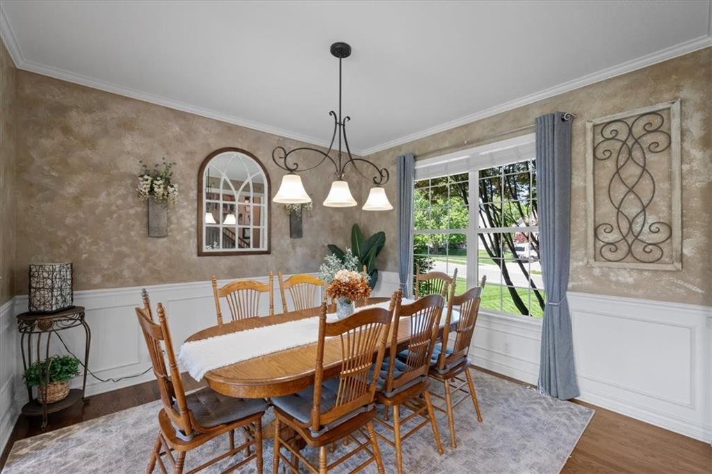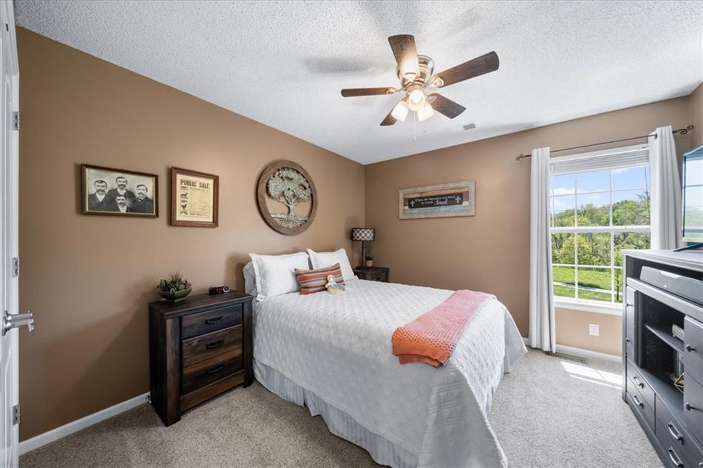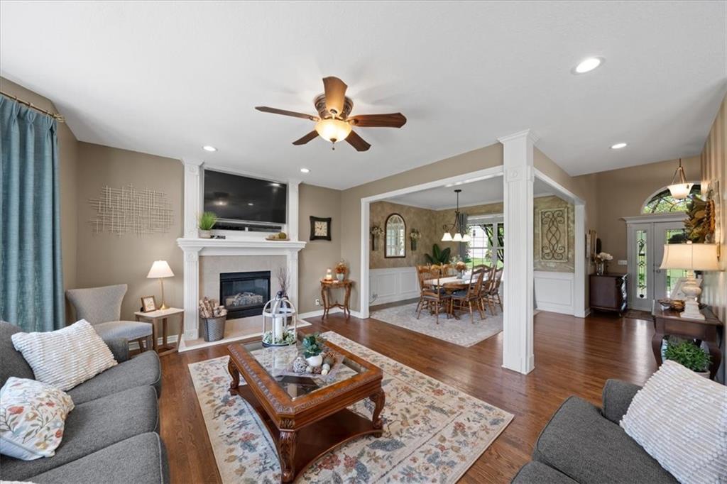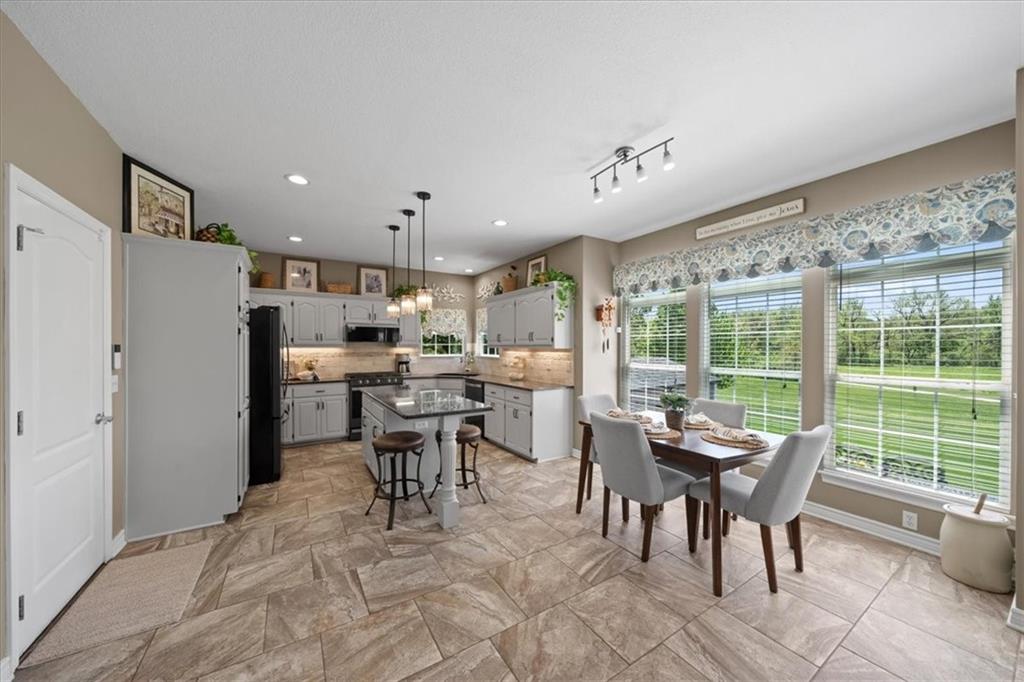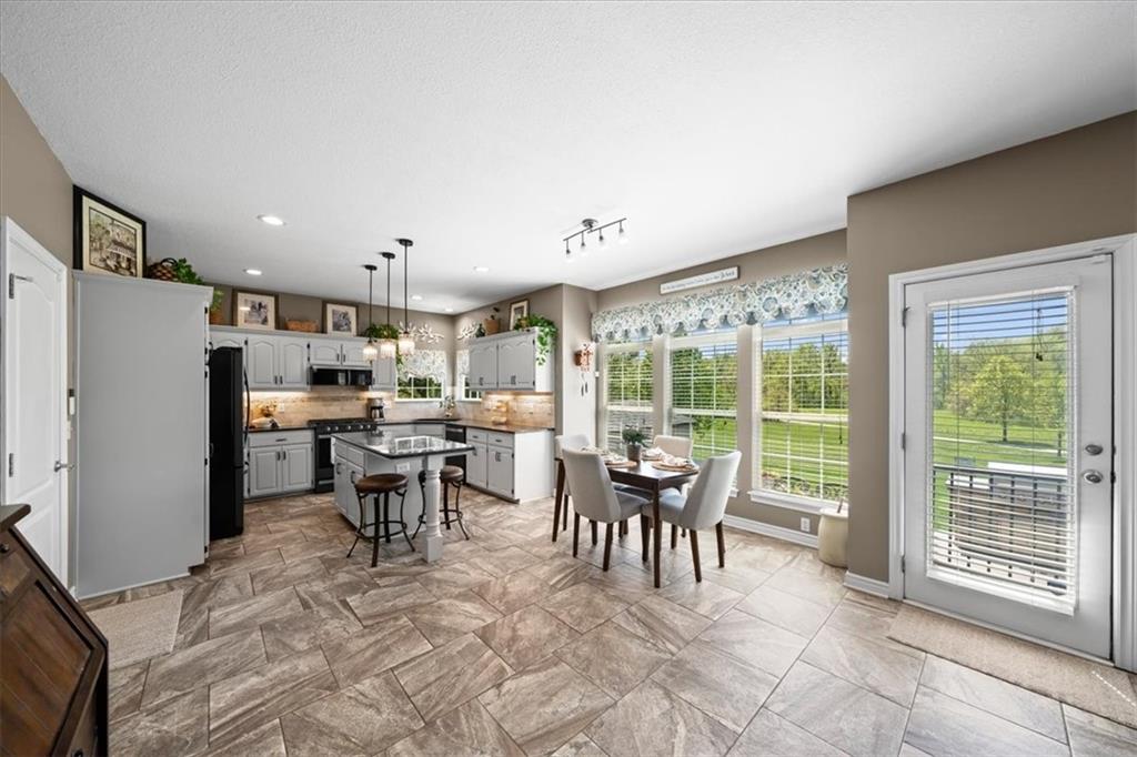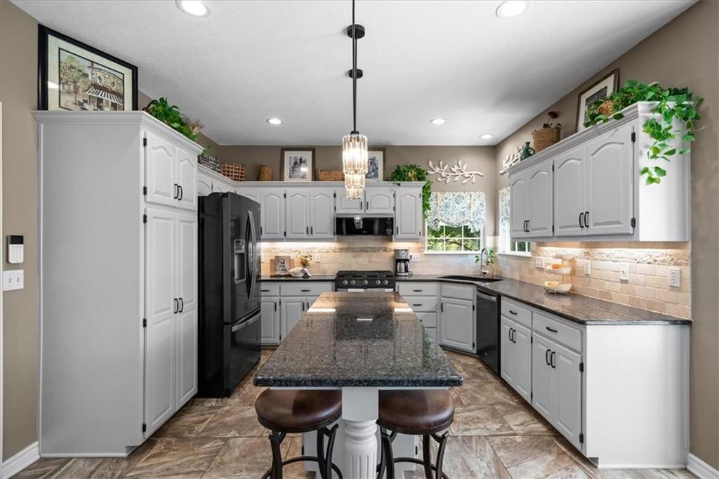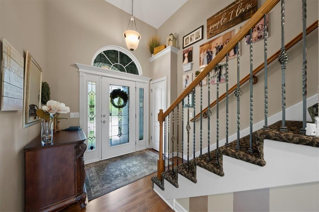 PRISTINE ONE OWNER HOME! This is a move-in ready home with 4–5 bedrooms, 4½-baths offers 3,160 square feet of refined living in the sought-after DeSoto School District. The main level features an open layout with hardwood floors in the family room and dining area. Kitchen includes updated cabinets, granite countertops, whirlpool appliances and extended island with a spacious eating area. Upstairs has four spacious bedrooms, two with 10-foot ceilings, large lighted closets, and three full baths all connected by hardwoods. The finished basement is ideal for entertaining, featuring extensive cabinetry, a large media center, whole-house and outdoor audio wiring, and a flexible bedroom or study. Ceilings are extra high for a spacious feeling. The two-car garage includes an 11-foot ceiling, built-in workbench, and ample overhead storage, plus a 12×8 Tuff Shed in the backyard. Recently replaced roof and newly painted house. Heating and Air Conditioner replaced around 6 years ago. Outdoor living is the perfect retreat on the 17×32-foot deck with built-in island, grill, granite countertops, firepit, accent lighting, and an electric awning. Enjoy watching the wildlife as the large yard opens to a meadow and tree lined creek with access to the Johnson County Trail system, offering direct access to local schools and exceptional everyday enjoyment.