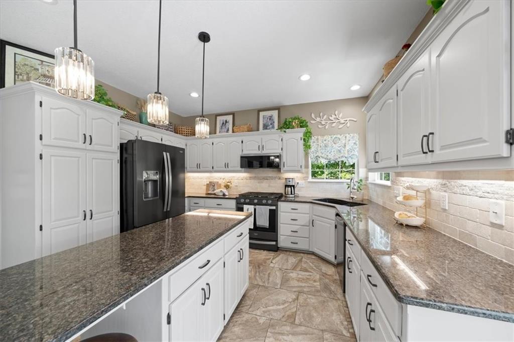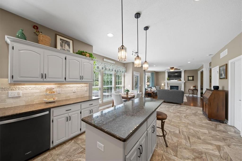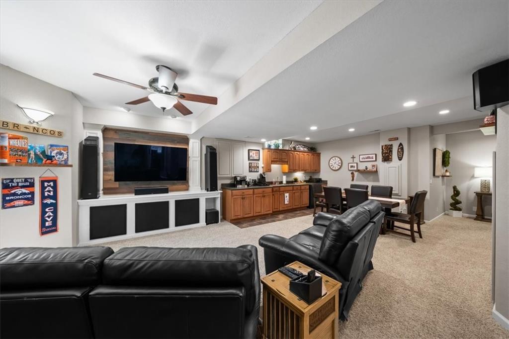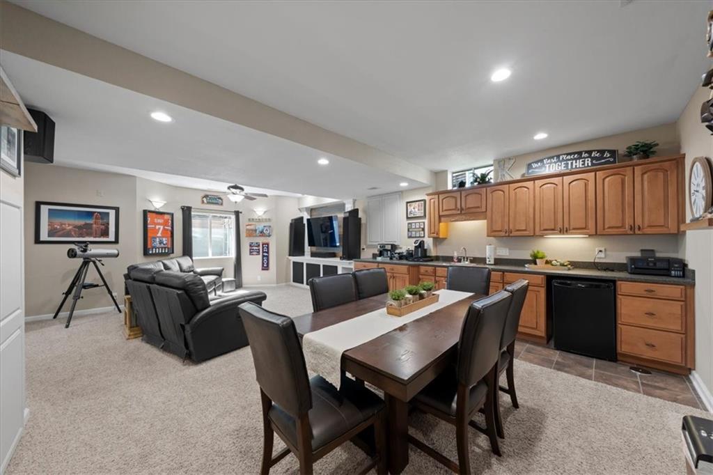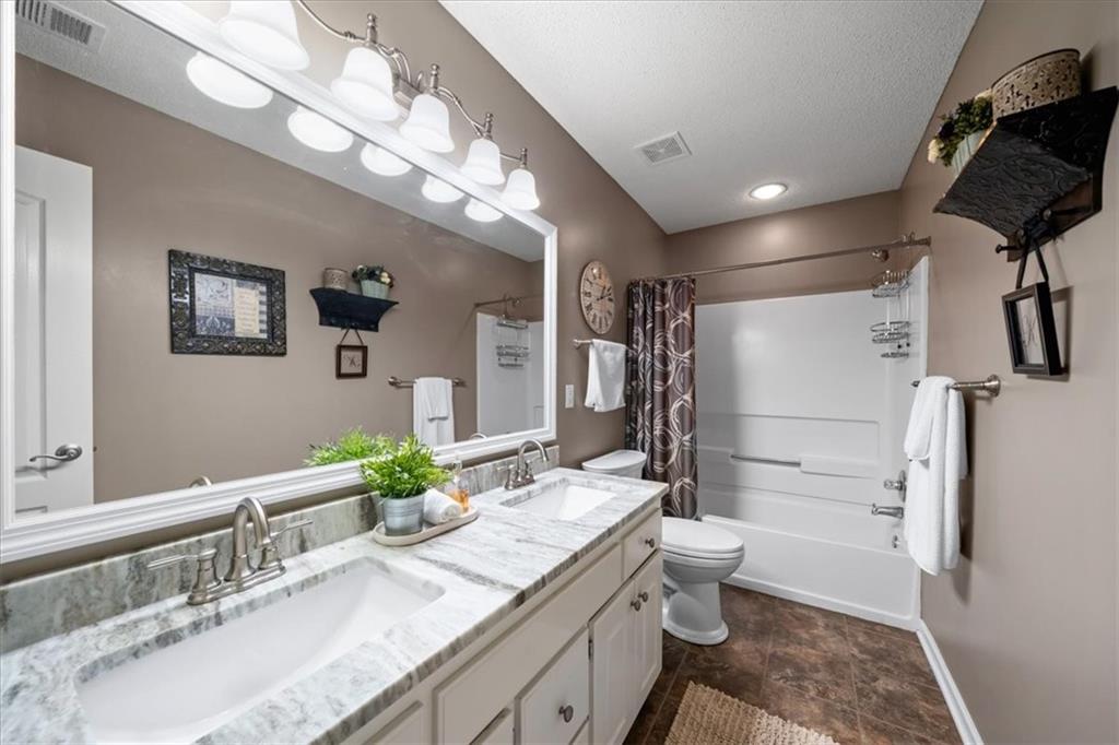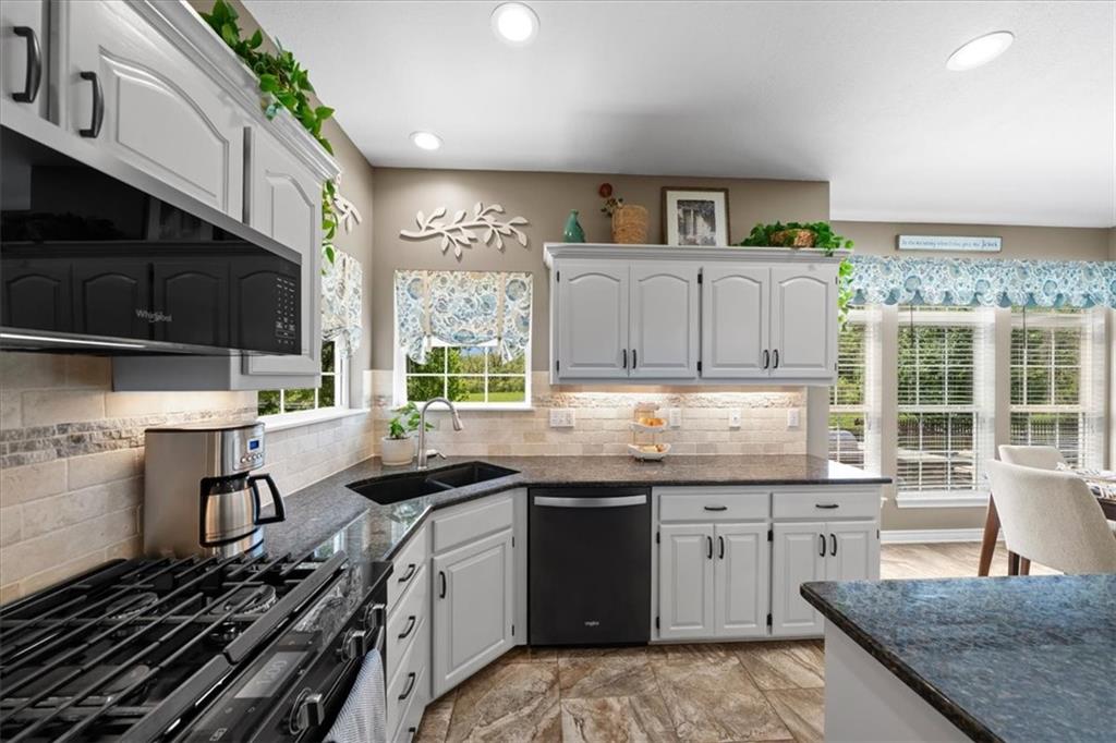 PRISTINE ONE OWNER HOME! This is a move-in ready home with 4–5 bedrooms, 4½-baths offers 3,160 square feet of refined living in the sought-after DeSoto School District. The main level features an open layout with hardwood floors in the family room and dining area. Kitchen includes updated cabinets, granite countertops, whirlpool appliances and extended island with a spacious eating area. Upstairs has four spacious bedrooms, two with 10-foot ceilings, large lighted closets, and three full baths all connected by hardwoods. The finished basement is ideal for entertaining, featuring extensive cabinetry, a large media center, whole-house and outdoor audio wiring, and a flexible bedroom or study. Ceilings are extra high for a spacious feeling. The two-car garage includes an 11-foot ceiling, built-in workbench, and ample overhead storage, plus a 12×8 Tuff Shed in the backyard. Recently replaced roof and newly painted house. Heating and Air Conditioner replaced around 6 years ago. Outdoor living is the perfect retreat on the 17×32-foot deck with built-in island, grill, granite countertops, firepit, accent lighting, and an electric awning. Enjoy watching the wildlife as the large yard opens to a meadow and tree lined creek with access to the Johnson County Trail system, offering direct access to local schools and exceptional everyday enjoyment.