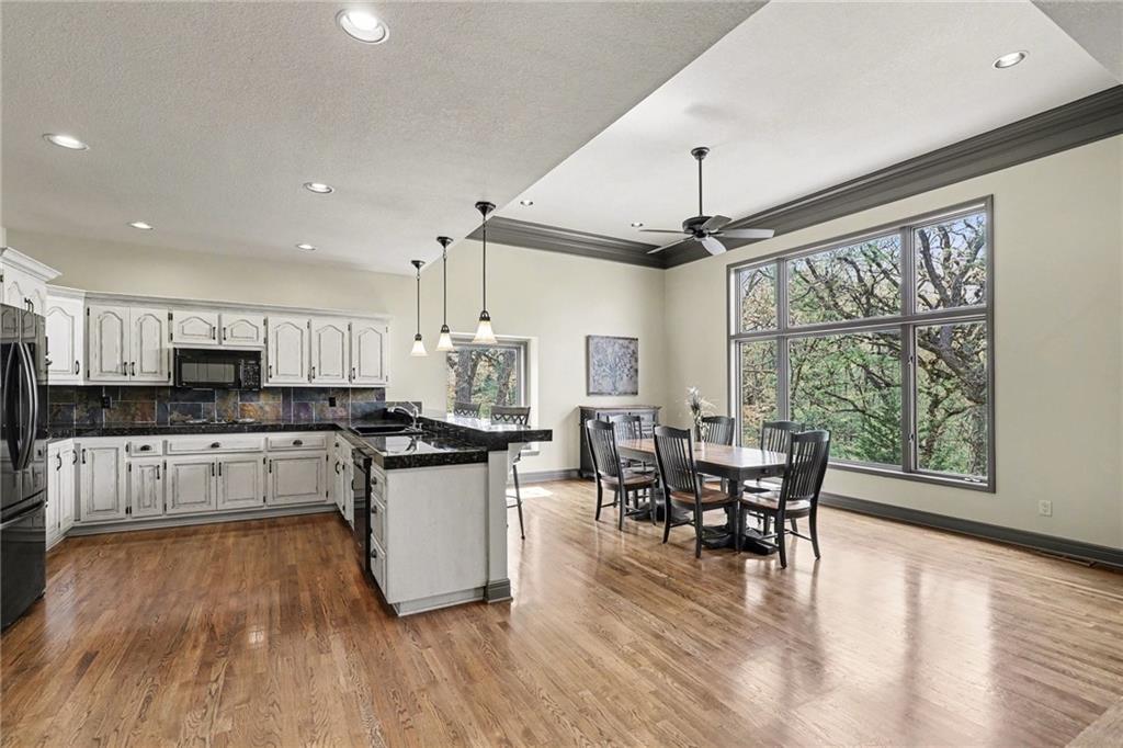 Stunning custom-built home where thoughtful design meets breathtaking views—come for the house, stay for the scenery. The chef’s kitchen is a showstopper with hardwood floors, custom cabinetry, granite tile countertops, a breakfast bar with seating, and stylish pendant lighting. The breakfast area features soaring ceilings, walls of windows, and access to the covered, screened-in porch—perfect for relaxing mornings or evenings. The inviting Great Room offers beautiful views of the treed backyard, upgraded trim, and a striking stone fireplace. The grand entry welcomes you with a vaulted ceiling, updated lighting, and tiled flooring. The primary suite is a retreat with bayed windows, a tray ceiling, and ceiling fan. The spa-like bath includes a double vanity with custom cabinetry, tiled floors, and a walk-in tiled shower. A secondary bedroom on the main level offers flexibility as a guest room or office. The large laundry room adds convenience with cabinetry and a sink. The lower level features a spacious living area with a corner fireplace and access to another covered deck, along with two generously sized bedrooms, a full bath, and a non-conforming bonus room. The next level is perfect for entertaining with a massive rec room, wet bar, and additional full bath. Walk out to the private, landscaped backyard and enjoy the serene, wooded setting year-round. Additional highlights include storage space under the two-car garage and a dedicated workshop area. This home truly has it all—space, function, and incredible views.