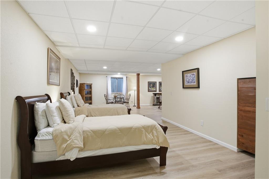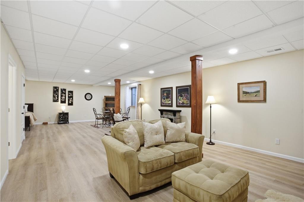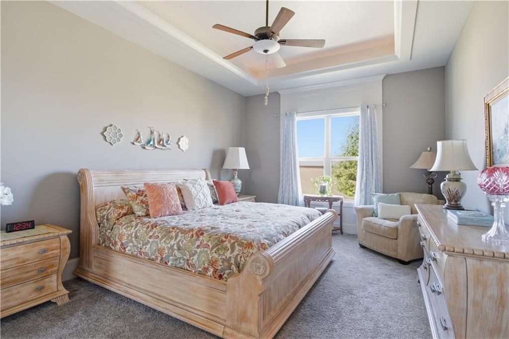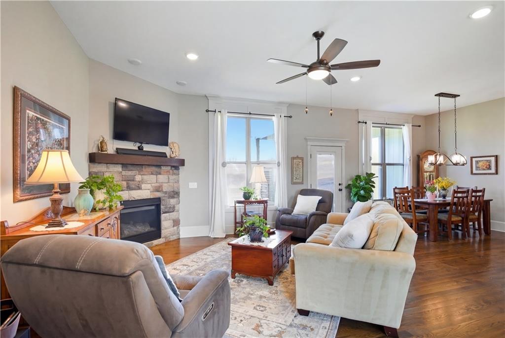 Former model home in highly desirable Greyhawke at the Lake! This spacious 4-bedroom, 3-bath residence offers an open and airy floor plan with tall 6-panel doors, large closets, and quality finishes throughout. The main level features three bedrooms, including a private primary suite with dual vanities, a jetted tub, a tiled glass walk-in shower, and a private water closet. Hardwood floors flow through the great room, dining area, and kitchen, and a gas fireplace anchors the living space perfect for both everyday living and entertaining. The finished daylight basement provides flexible space for recreation, guests, or hobbies. Step outside to enjoy the covered patio overlooking a beautifully landscaped corner lot that adjoins green space and includes an in ground sprinkler system. A security system and internal antenna streaming system are added bonuses. The three car attached garage offers plenty of room for vehicles, storage, or lake gear. Recent updates include a new roof and gutters for added peace of mind. Located just minutes from Smithville Lake and Paradise Pointe Golf Complex, with easy access to top-rated Smithville schools and Northland amenities, this home delivers space, comfort, and an unbeatable location.