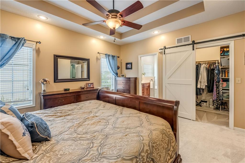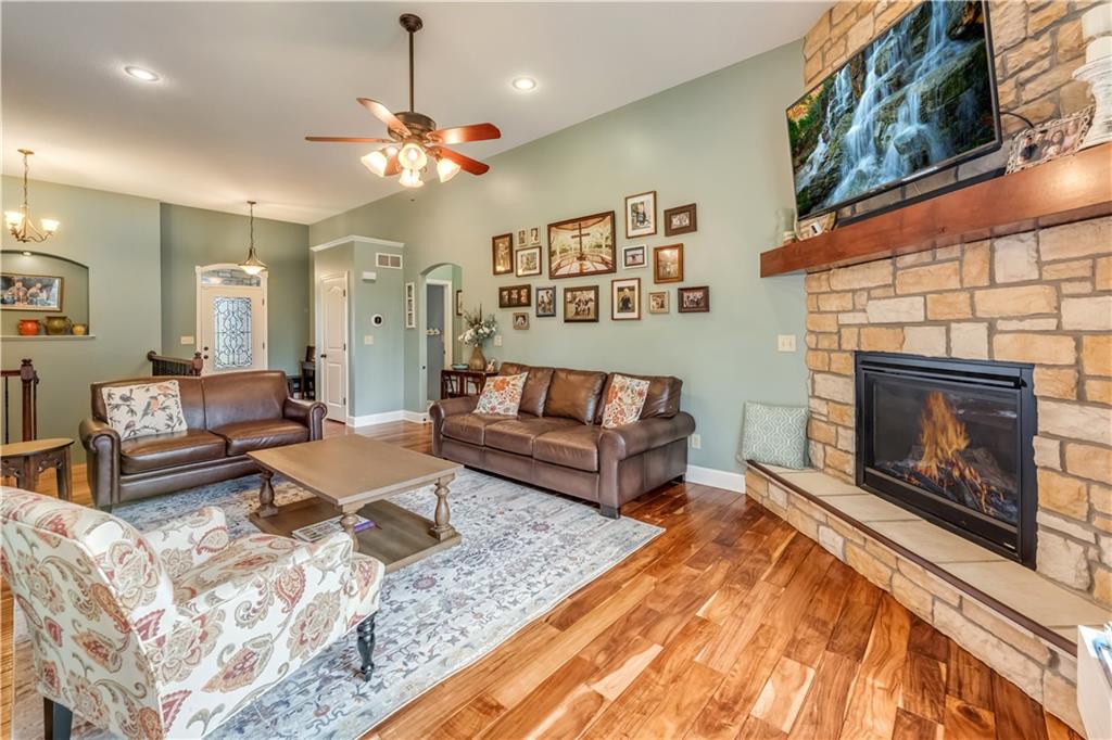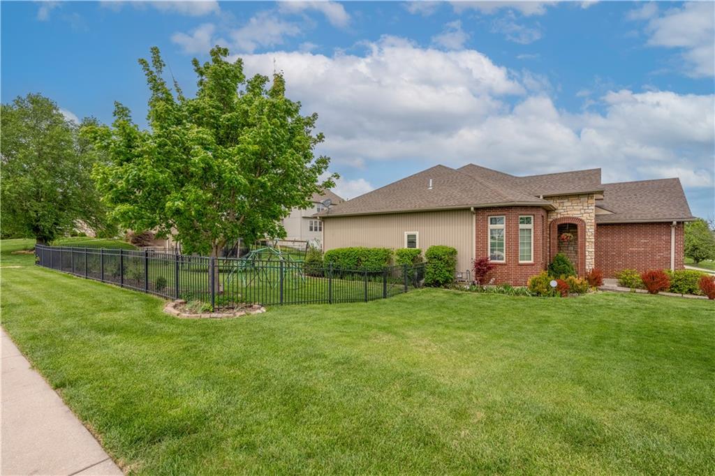 Your beautiful home is ready for you in the desirable Cayhill subdivision, known for holiday events, walkability, and commuting convenience to Whiteman AFB! This immaculate reverse ranch sits on a large corner lot with subdivision lake privileges, just minutes to shopping and restaurants in town. The welcoming front porch ushers you into warm hardwood hand-scraped floors and an open concept great room with tall ceilings. Enjoy the warmth of the gas fireplace with stone surround and still have connection to the Kitchen/Dining Room activities. Sellers have increased energy efficiency with window replacement in LR, DR, back secondary Bedroom, and hall Bathroom June 2025. Your large Kitchen has an abundance of custom wood cabinetry, granite counters, stainless steel appliances that all stay (Fridge, double oven, and dishwasher less than a year old!) and a dedicated pantry directly off the Kitchen. Main floor laundry is also nearby. The generous Primary Bedroom showcases a walk-in closet, newer carpet, and a beautifully updated on-suite Bathroom with new floor tile, newly tiled shower, new glass door, double vanity, and jetted tub. The two secondary Bedrooms have larger closets with storage systems and newer carpet with the hall Bathroom between. The lower level includes a full bar (drink fridge will stay) and service area off of the spacious Family Room, the 4th true Bedroom with a walk-in closet, another nonconforming room for many uses, and a 3rd full Bathroom. The 300 SF storage area includes a utility sink, storm shelter, NEW AC and furnace in 2025! Head out the patio door upstairs to the screened-in deck for relaxation without bugs! The basement patio leads up to the wide, newly stained back deck with a dedicated gas line for a firepit or grill. Play options abound with a swing-set and more in the fenced yard with in-ground sprinkler system. Come make new memories here!