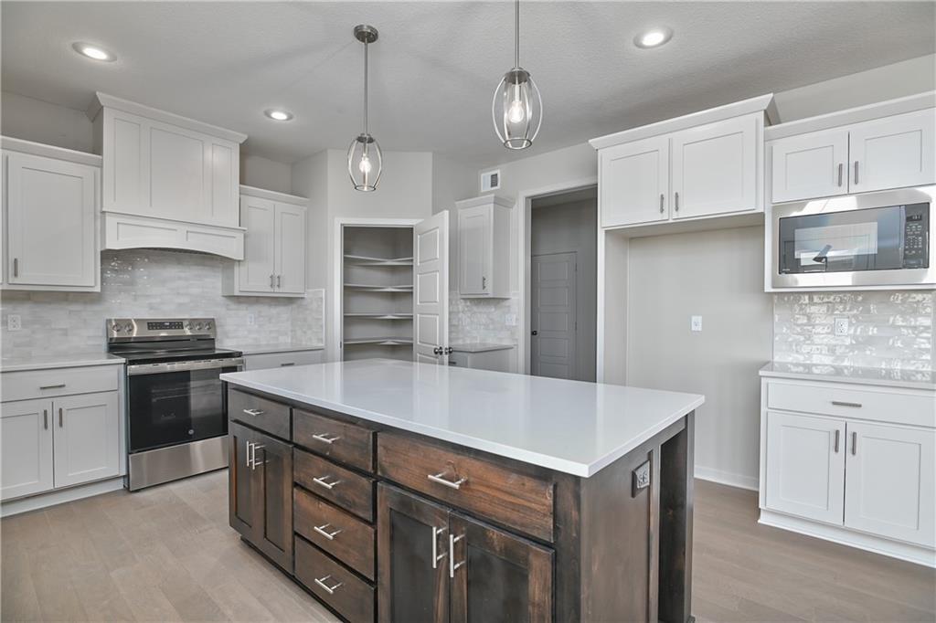 This stunning 2-story Harlow 5 home offers 5 bedrooms, 4 baths, and a spacious 3-car garage in the highly sought-after Prairie Farms community. From the moment you enter, you’ll be impressed by the beautiful turned staircase and gleaming hardwood floors in dining room, entry, kitchen and great room. The formal dining room features built-in cabinetry on both sides and flows seamlessly into a bright, open great room with a cozy fireplace and abundant natural light. The adjacent dining area and chef’s kitchen are an entertainer’s dream—highlighted by hardwood floors, granite countertops, a large center island, apron-front sink, painted custom cabinets with soft-close doors and drawers, upgraded hardware, stainless steel appliances, built-in microwave, and a generous walk-in pantry. A main-level bedroom with a closet offers flexibility as a guest suite, office, playroom, craft space, or more. Upstairs, the luxurious owner’s suite boasts a spa-like bathroom with double granite vanities, tile floors, a free-standing soaking tub, and a walk-in tiled shower. A spacious walk-in closet connects directly to the conveniently located laundry room. Two secondary bedrooms share a Jack & Jill bath, each with its own private vanity. A fourth upstairs bedroom features its own private bath and walk-in closet. Additional highlights include a huge unfinished basement with abundant storage potential, an in-ground sprinkler system, and more. Community amenities include a large swimming pool, cabana, playground, and walking trails. Plus, Prairie Farms is adjacent to the newly renovated Lake Olathe, offering paddleboarding, fishing, hiking, and more—making this a perfect place to call home! Photos are of previous homes and may show some optional features.