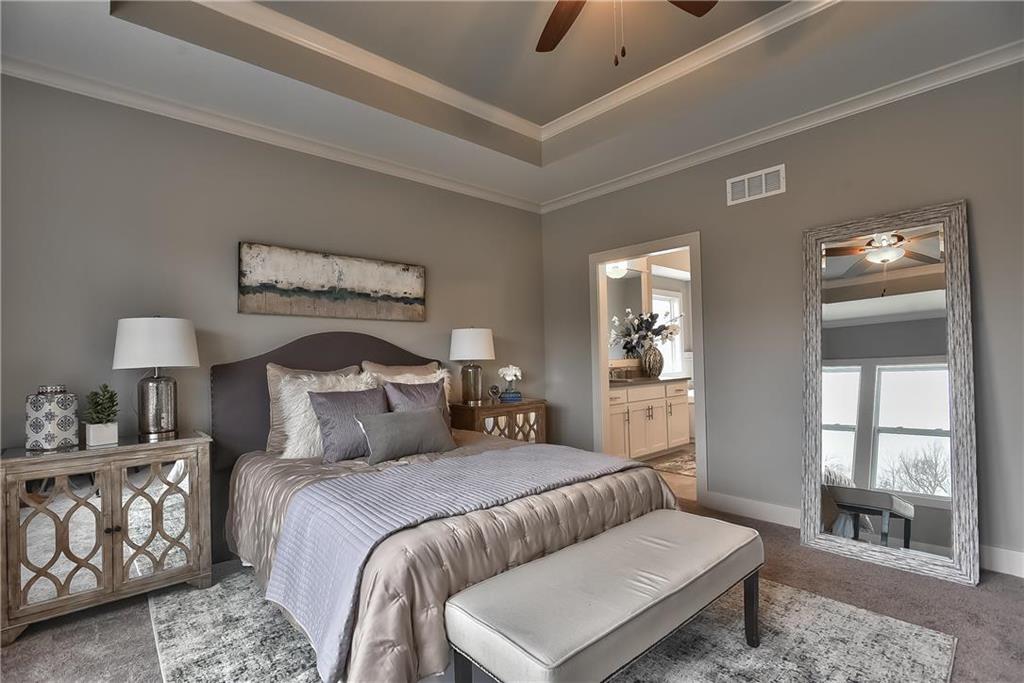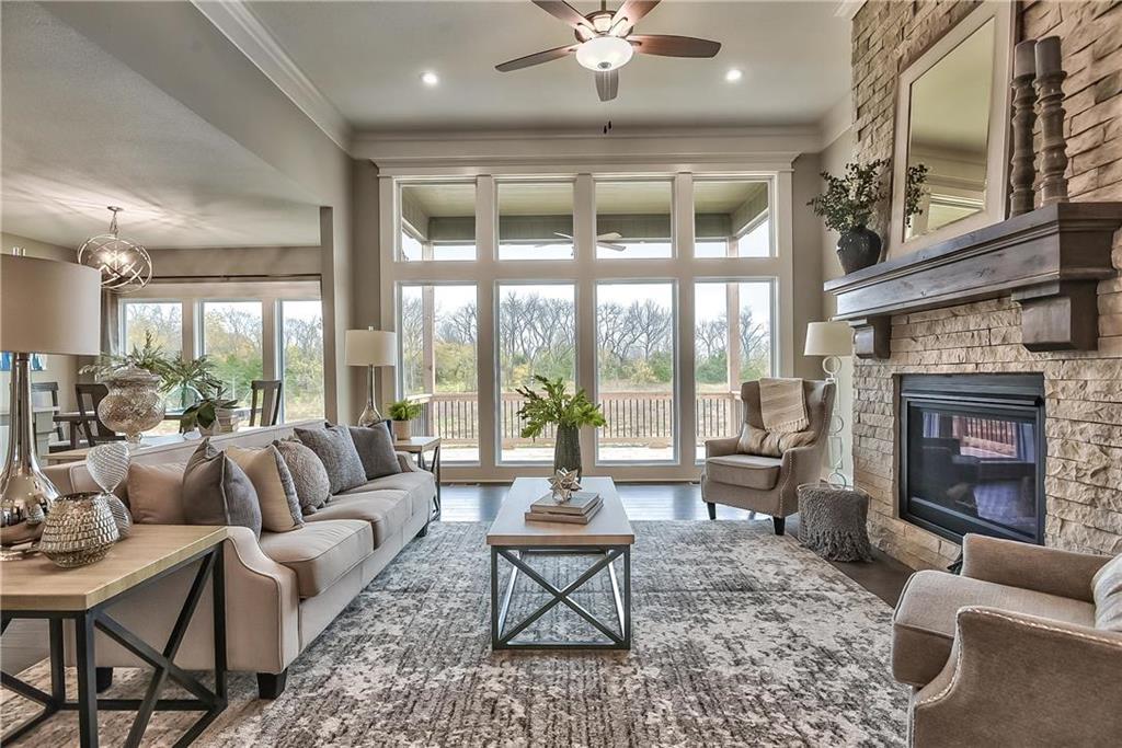 Want some privacy? This Dakota reverse sits on a beautiful walk out lot backing to trees. Nice hardwood floors run throughout the entry, great room, dining area, kitchen and mud room. The great room includes a stunning fireplace and wall of windows giving you lots of natural light. Walk out from the dining area to a wonderful covered deck with a peaceful view of the treed backyard and greenspace. Center island kitchen with granite countertops is a cook's delight featuring an apron sink, custom cabinets with cabinet hood, upgraded cabinet hardware with soft closing drawers & doors, built in microwave, undercabinet lighting, stainless appliances and a large walk in pantry. The owner's suite with its vaulted ceiling and wall of windows leads into a lovely bath with separate granite vanities, walk in tiled shower, separate tub and walk in closet. Laundry room is connected to the master bath for your convenience. The second bedroom on the main floor is a great multipurpose room for a guest room, craft room, office, etc. ice sized mud room with large boot bench,, coat closet and a 3/4 bath just off the back hallway. Follow the U-shaped staircase down to the rec room with wet bar and plenty of room for a home theater plus a game table. Walk out from the rec room to enjoy the private backyard. Two more bedrooms and bath complete the finished lower level. Lots of storage in the unfinished basement. Storm room included for your safety in case of a storm. Three car garage and sprinkler system. Prairie Farms has a great community pool, play area and walking trails. It's a great place to call home.