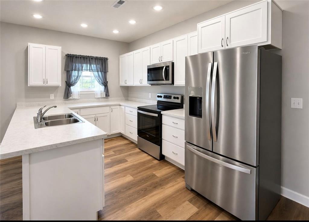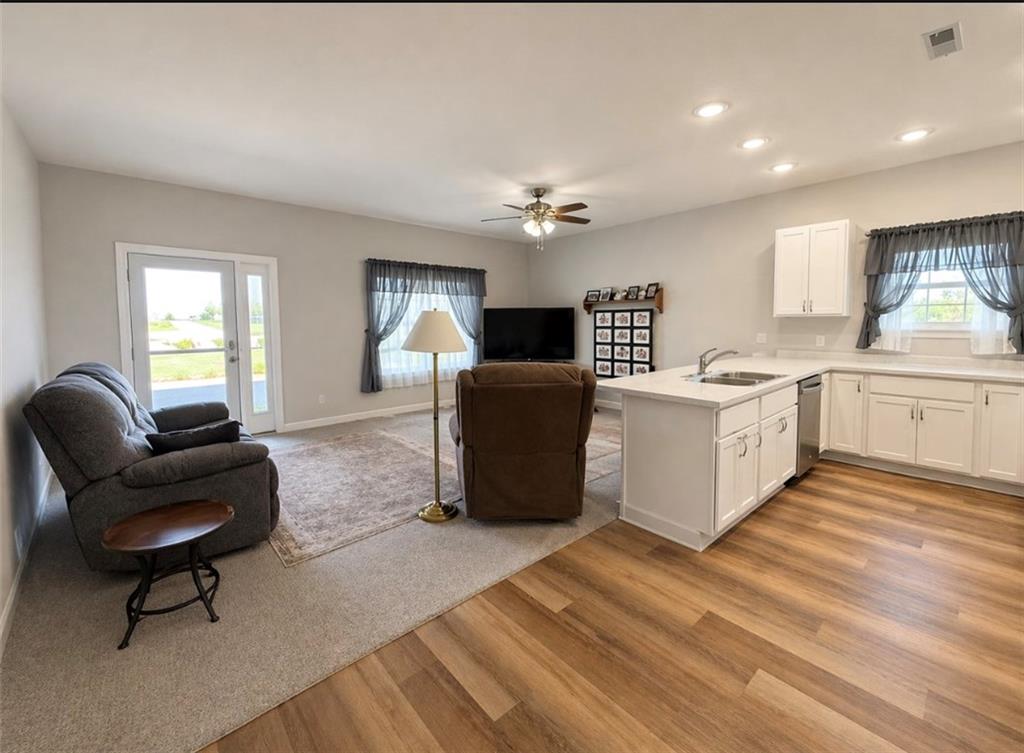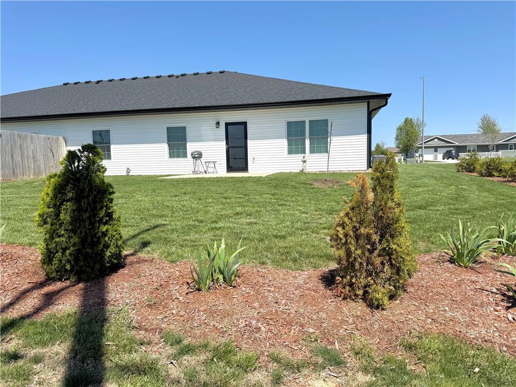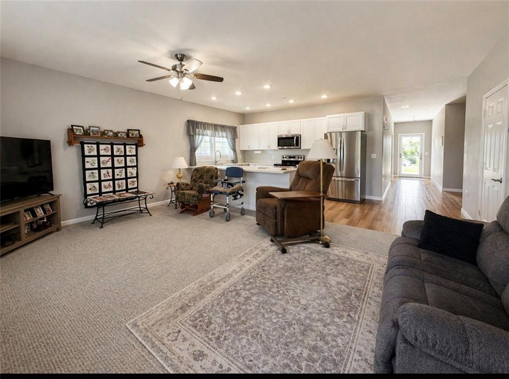 Rare find! This beautifully maintained, like-new one-level townhome offers a spacious open floor plan with 3 bedrooms and 2 full bathrooms—perfect for comfortable, easy living. Enjoy the convenience of a large attached garage featuring an oversized 18' x 8' door, ideal for taller or larger vehicles. The home includes durable laminate flooring throughout, creating a clean, modern look with low maintenance. The spacious bedrooms provide ample closet space, and you'll appreciate the abundance of storage throughout the home. All appliances and window treatments stay, making this truly move-in ready. The primary suite boasts a spacious en suite bath and a large wail-in closet. Recent upgrades add peace of mind, including a roof with a remaining 2-year warranty and energy-efficient triple-pane windows with a lifetime transferable warranty for the new owner. Designed with accessibility in mind, this home is handicap accessible and offers the ease of single-level living. Situated on the edge of town, you’ll enjoy beautiful landscaping and a quiet setting.
