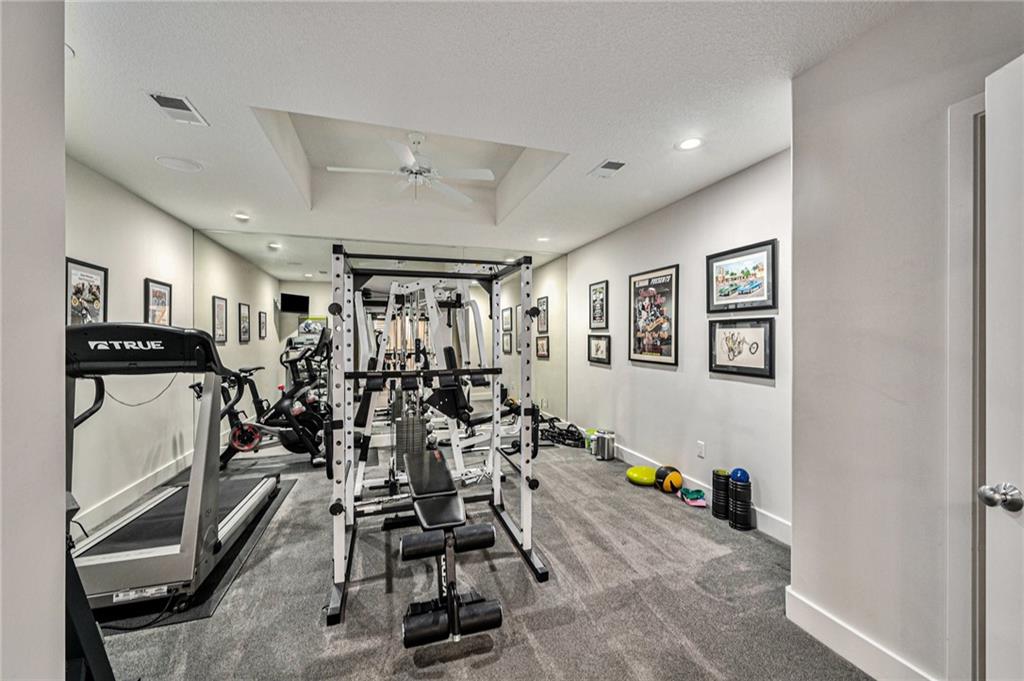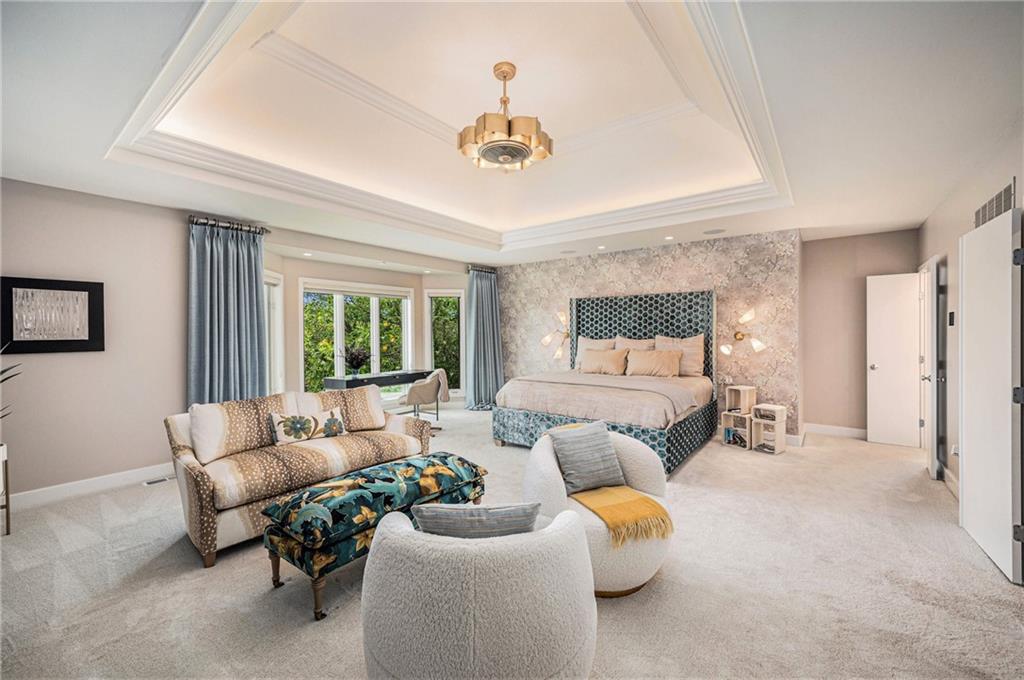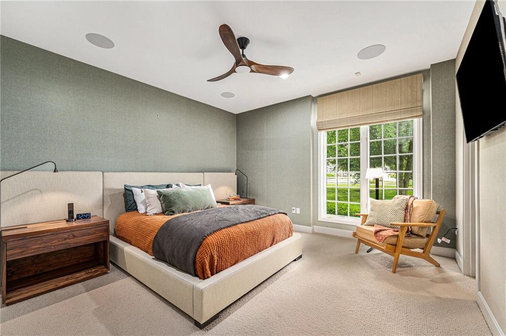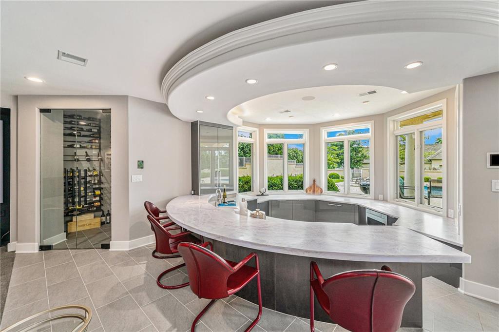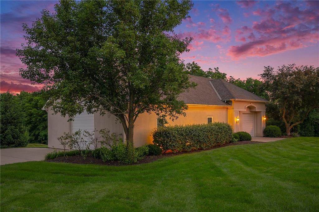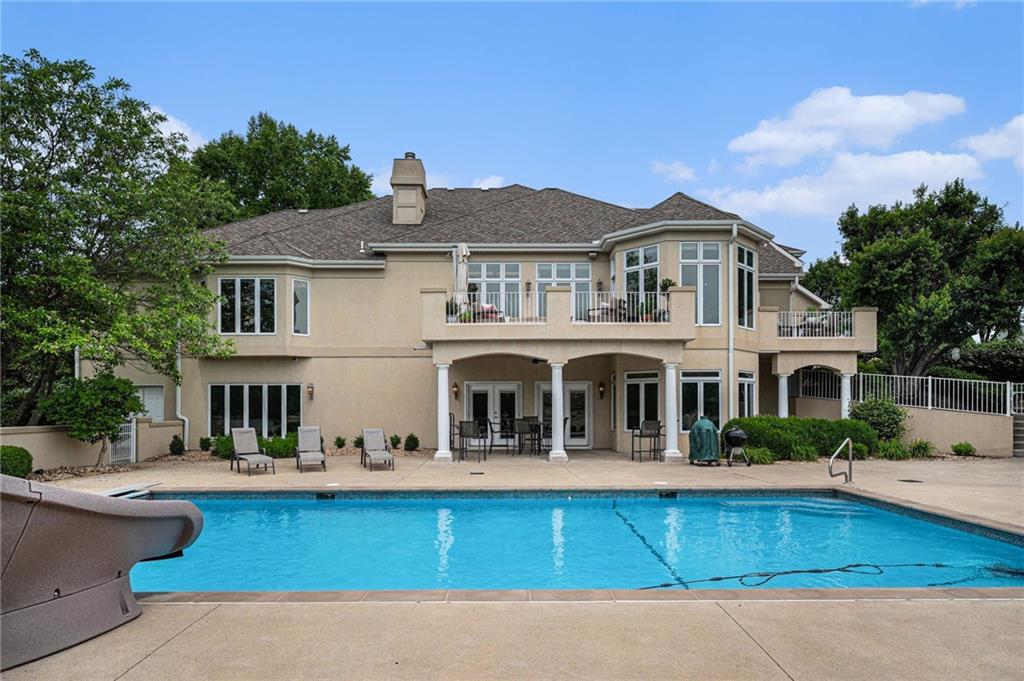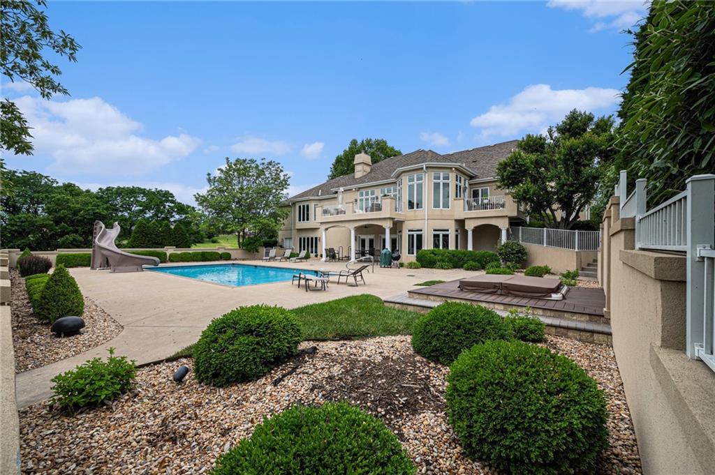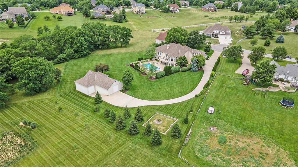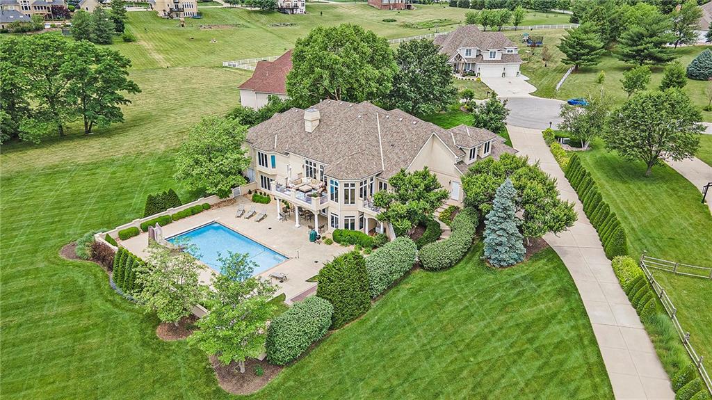 Experience tranquility and sophistication in this stunning 1.8-acre estate, ideally located just outside Kearney city limits and less than 30 minutes from downtown Kansas City, MO. Reimagined in 2021 by Portfolio Kitchen & Home, this home blends modern luxury with timeless elegance. Expansive floor-to-ceiling windows fill the main level with natural light while showcasing views of the sparkling 20’x40’ granite pool. The chef’s kitchen impresses with dual ovens, two Quartzite islands, a butler’s pantry with prep sink, Bosch and Wolf appliances, a wine refrigerator, hidden microwave and coffee station, and a spacious walk-in pantry. The lower level is perfect for entertaining, featuring a 128” projection screen with surround sound, custom wine cellar, sunken bar, exercise room, craft/dining area, and a large game space. A 60’x30’ outbuilding with an adjoining 28’x13’ RV bay includes heating, cooling, concrete floors, and a half bath. Refer to supplements for a complete list of additional features.