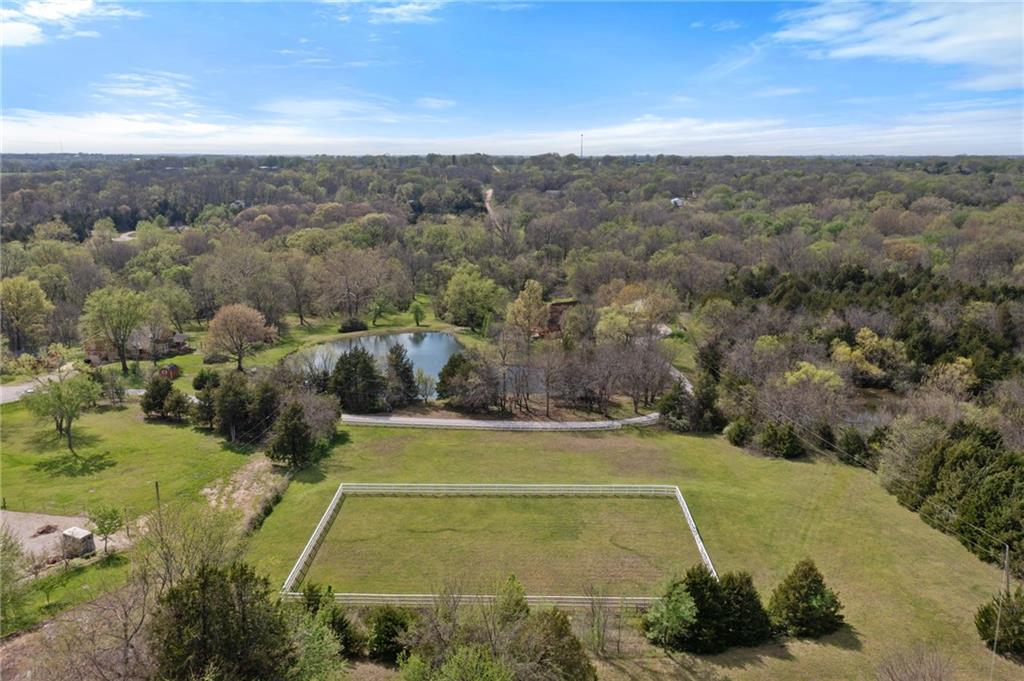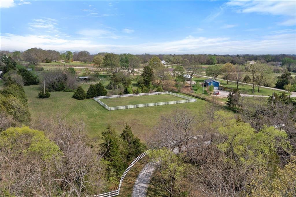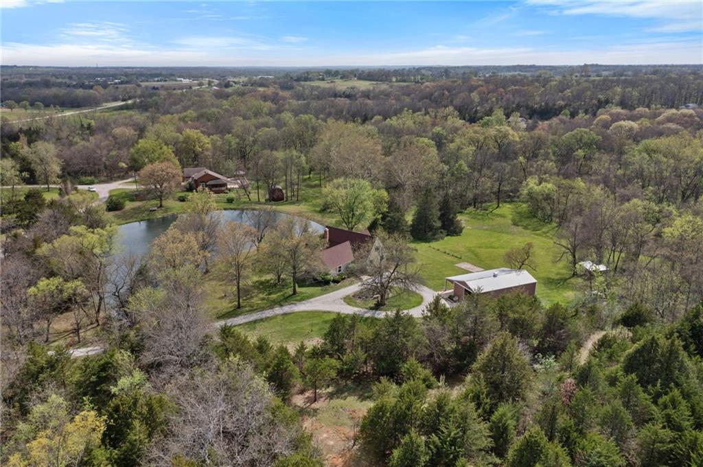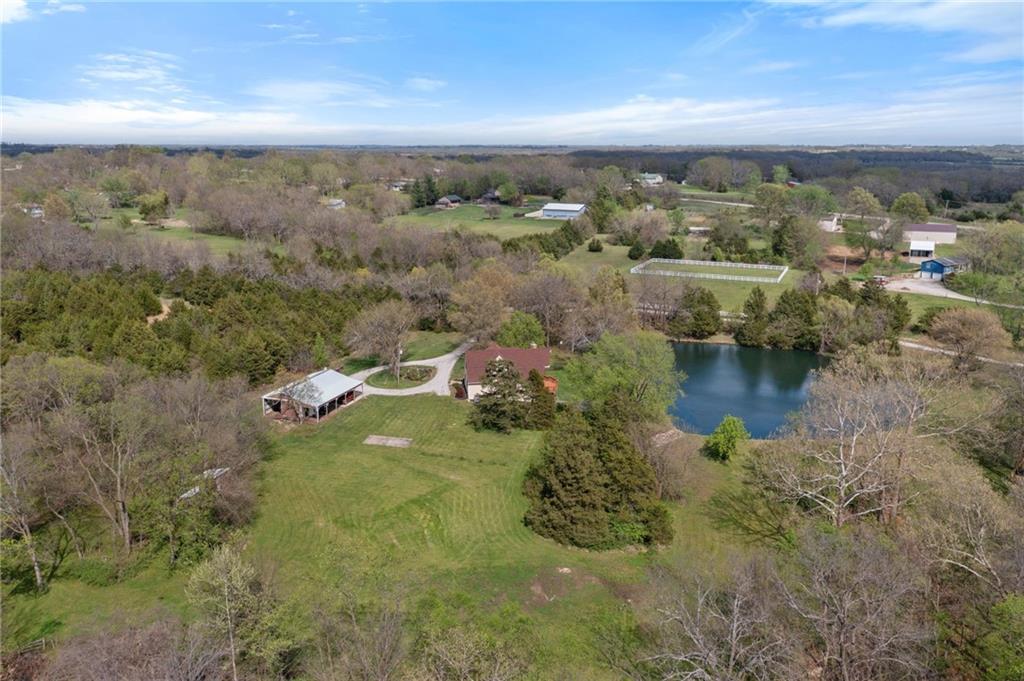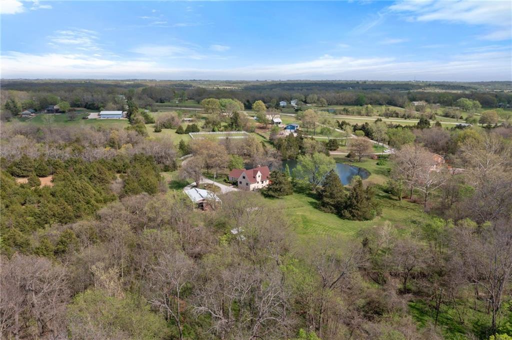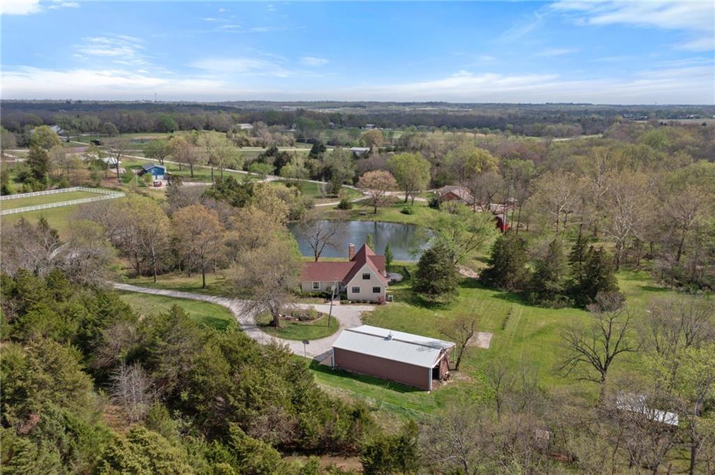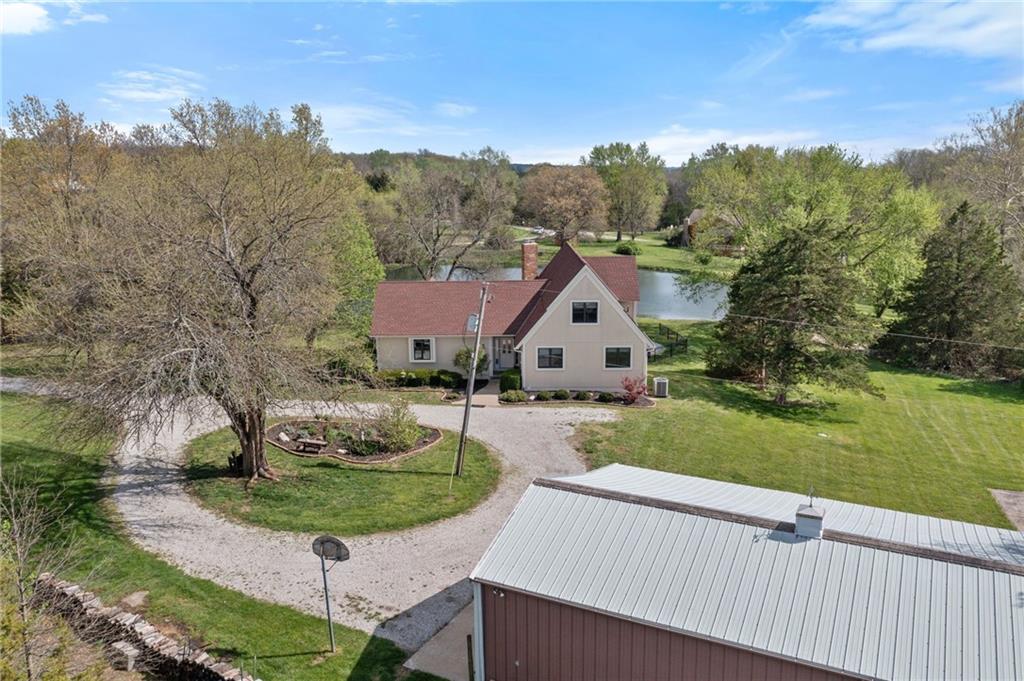 Discover a true private retreat in this one-of-a-kind A-frame estate, tucked away in a private 8-acre park-like setting just minutes from Hillsdale Lake. Designed to honor the land, this residence harmonizes rustic soul with modern functionality, offering a level of seclusion and beauty that is impossible to replicate. The heart of the home is the soaring, light-filled A-frame living area, where floor-to-ceiling windows frame incredible views of the pond and surrounding nature. This space is anchored by a majestic fireplace featuring a recently restored lifetime-warrantied flue system. The modern kitchen addition serves as a perfect bridge between the home’s original character and today’s needs, boasting custom cabinetry, double ovens, and 2021 granite surfaces. The upper level serves as a versatile getaway, featuring a full bathroom, a large bedroom, and a private landing that functions as a unique "balcony" office or nursery space. From this vantage point, you can work or relax while taking in the same expansive views from a higher perspective. For equestrian enthusiasts and hobbyists, the property features a riding arena expertly graded for drainage, an equestrian barn with 3 tongue-in-groove horse stalls, a tack room, and a shop area with reinforced concrete floors. The estate is further enhanced by a chicken coop, an aviary, and established black raspberry bushes. This meticulously maintained home offers peace of mind with a 2021 roof, dual HVAC systems under warranty, and most windows replaced in 2020-21. Located with incredible accessibility to the KC Metro, this is a rare opportunity to own a lifestyle of total privacy and architectural character without compromise.