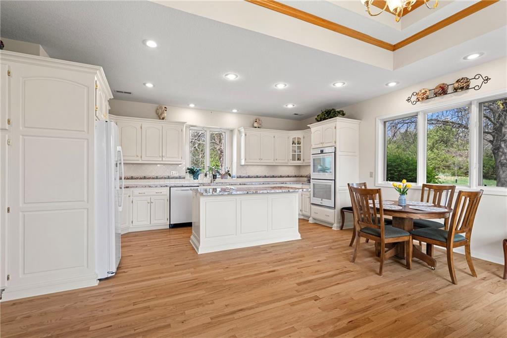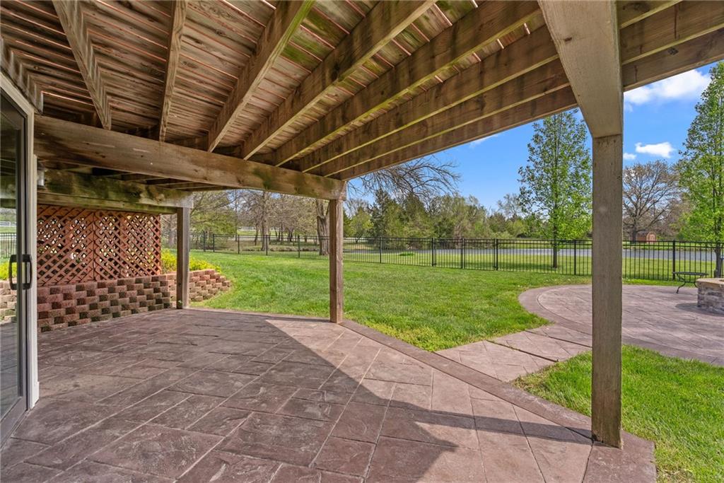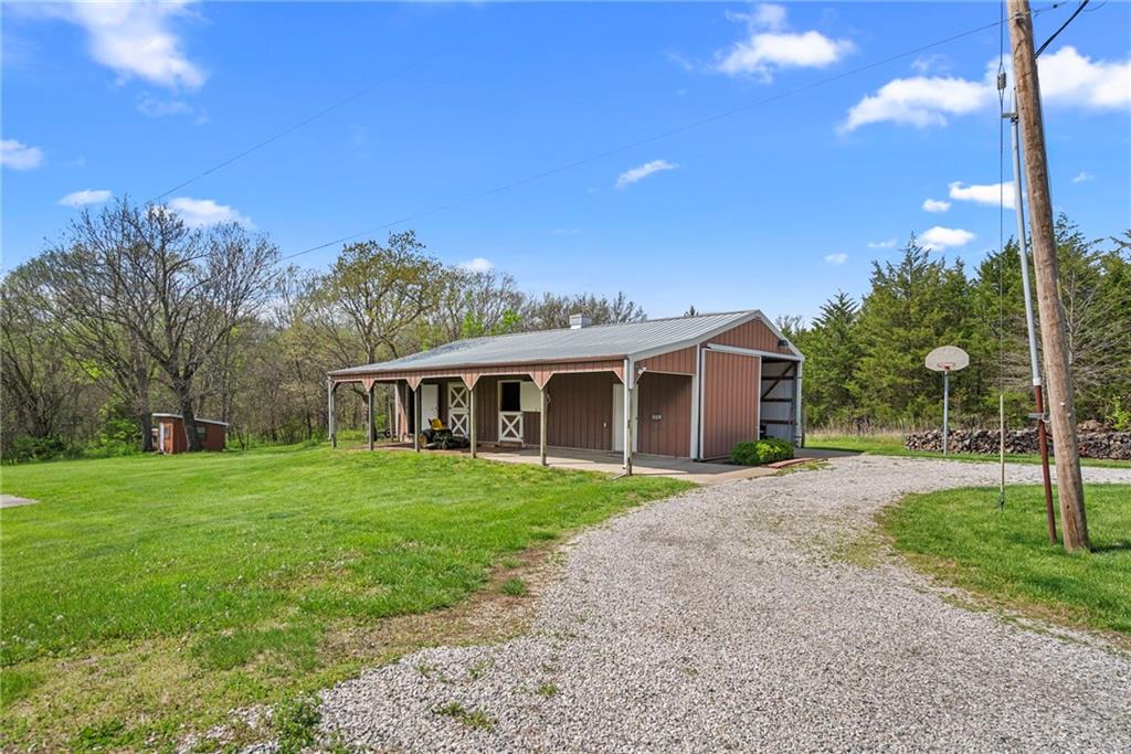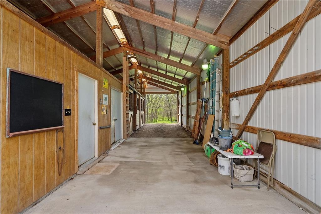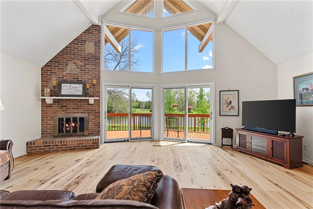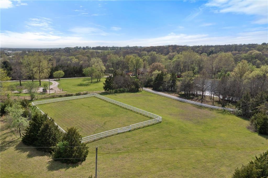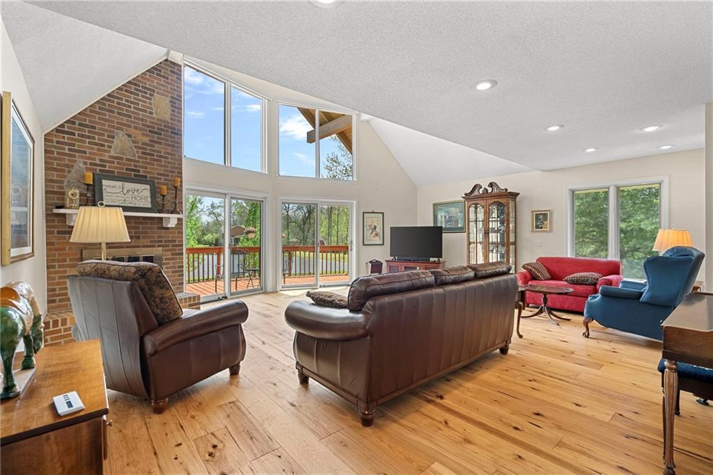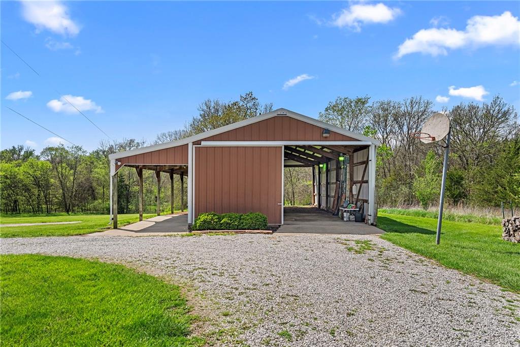 Discover a true private retreat in this one-of-a-kind A-frame estate, tucked away in a private 8-acre park-like setting just minutes from Hillsdale Lake. Designed to honor the land, this residence harmonizes rustic soul with modern functionality, offering a level of seclusion and beauty that is impossible to replicate. The heart of the home is the soaring, light-filled A-frame living area, where floor-to-ceiling windows frame incredible views of the pond and surrounding nature. This space is anchored by a majestic fireplace featuring a recently restored lifetime-warrantied flue system. The modern kitchen addition serves as a perfect bridge between the home’s original character and today’s needs, boasting custom cabinetry, double ovens, and 2021 granite surfaces. The upper level serves as a versatile getaway, featuring a full bathroom, a large bedroom, and a private landing that functions as a unique "balcony" office or nursery space. From this vantage point, you can work or relax while taking in the same expansive views from a higher perspective. For equestrian enthusiasts and hobbyists, the property features a riding arena expertly graded for drainage, an equestrian barn with 3 tongue-in-groove horse stalls, a tack room, and a shop area with reinforced concrete floors. The estate is further enhanced by a chicken coop, an aviary, and established black raspberry bushes. This meticulously maintained home offers peace of mind with a 2021 roof, dual HVAC systems under warranty, and most windows replaced in 2020-21. Located with incredible accessibility to the KC Metro, this is a rare opportunity to own a lifestyle of total privacy and architectural character without compromise.