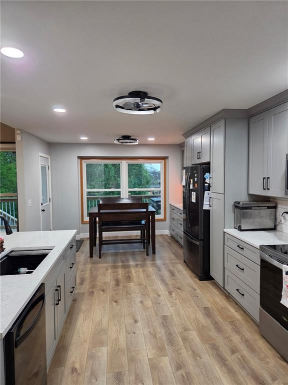 This beautifully updated level ranch offers 4 bedrooms, 3 full baths and a spacious walkout in a highly desirable Quail Creek Subdivision. The home has been transformed with major upgrades including a new roof and gutters, new A/C unit, new windows and new doors for improved for comfort and efficiency. Inside , you'll love the new open-concept design featuring all new flooring, brand new kitchen and appliances and a stylish new electric fireplace on the main floor. The basement expands your living space and includes a new gas fireplace , perfect for cozy evenings. Step outside to an expanded deck, ideal for relaxing or entertaining while enjoying the peaceful surroundings. With modern finishes and thoughtful updates throughout, this level ranch is truly move -in ready and a standout in Quail Creek.