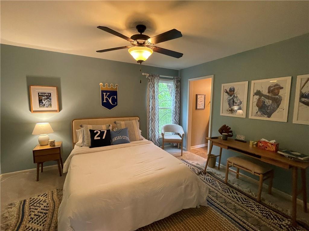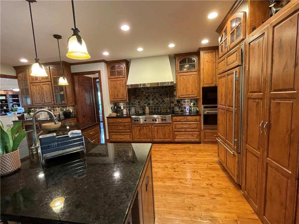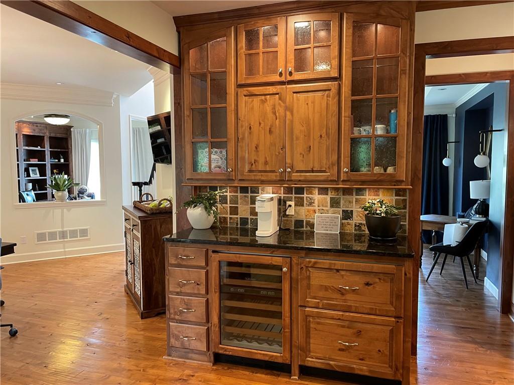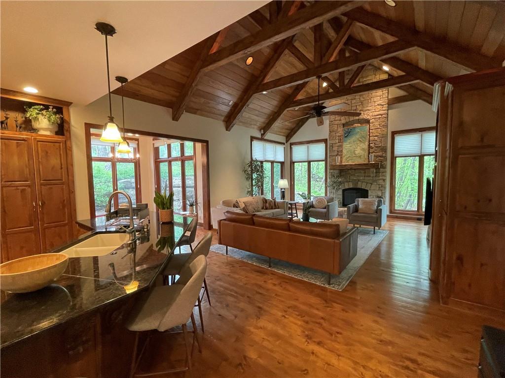 Discover the Allure of Elevated Living in this Impressive Updated Colorado-Style Home Nestled in the heart of Kansas City North, the two-story residence in Maple Park Estates radiates charm and sophistication, effortlessly blending the serene beauty of nature-immersed living with modern convenience. If you seek a haven perfect for both entertaining and unwinding from the daily grind, this home is a sanctuary designed to elevate your lifestyle. As you step inside, you are greeted by exquisite hand-textured hardwood floors that complement the expansive and unique open floor plan. A floor-to-ceiling glass wall at the rear of the home invites the stunning beauty of nature into your living space, creating an ambiance that feels as though you are nestled within a tranquil mountain range. The chef-inspired custom kitchen is a culinary oasis, featuring luxe appliances and extensive custom cabinetry, seamlessly integrated to match the refrigerator, ensuring a cohesive and polished look. Adjacent to the kitchen, you'll find a large dining area that leads to library/office with tailored bookcases specifically designed for the remarkable space. Unwind in the great room with a striking stone fireplace that sets the stage for the lodge feel. This space is perfect for relaxation or hosting cherished moments with family & friends.Venturing downstairs, the finished basement provides additional living & entertaining areas, providing ample space for gatherings or cozy nights in. The thoughtful layout includes an abundance of storage, a stylish wet bar, and a versatile bonus room that can serve as a personal gym or an extra sleeping area. Throughout this magnificent home, there are numerous upgrades that enhance its allure, including a new HVAC system, updated windows, fresh carpet, and a fresh coat of paint. Every detail has been meticulously considered, making this residence truly move-in ready.Experience luxury living at its finest in this stunning Colorado-style home.